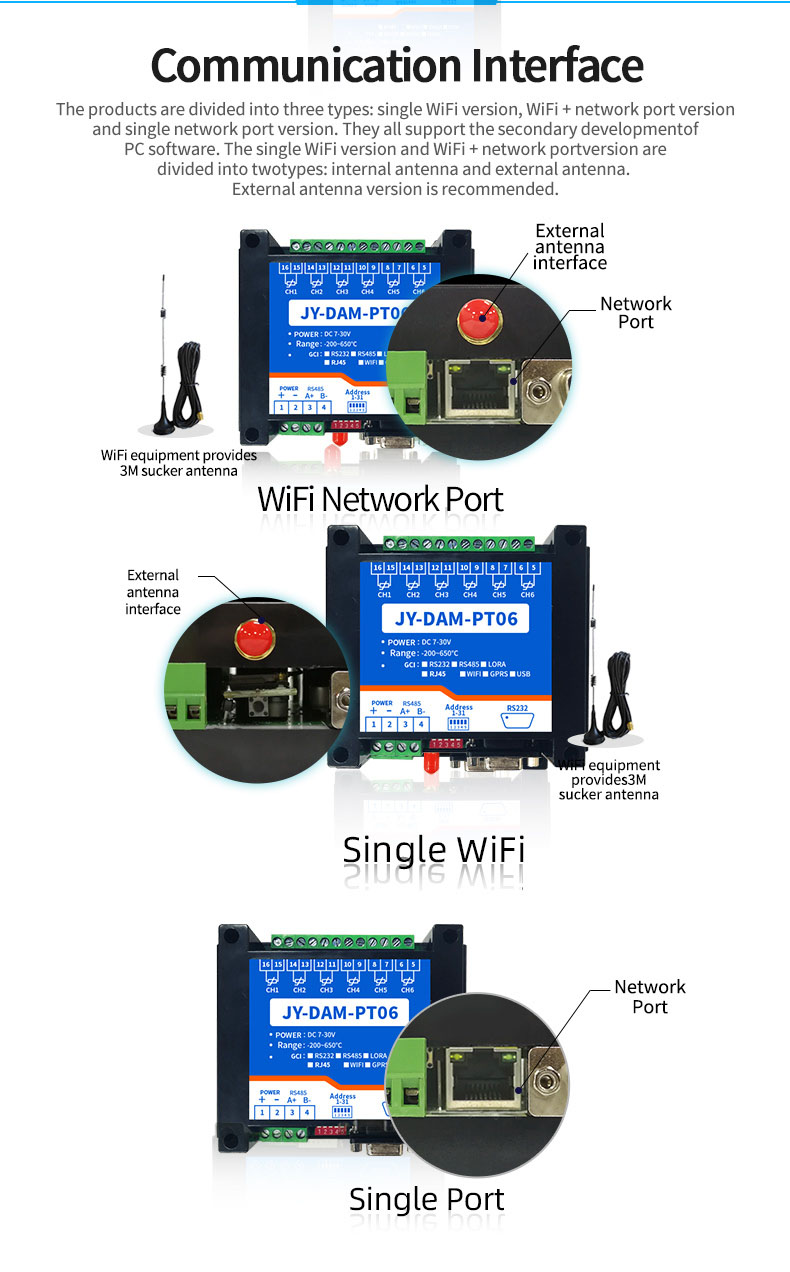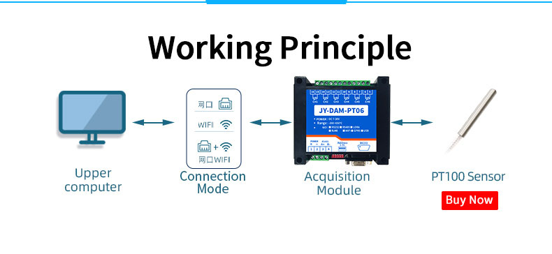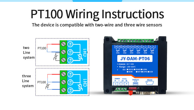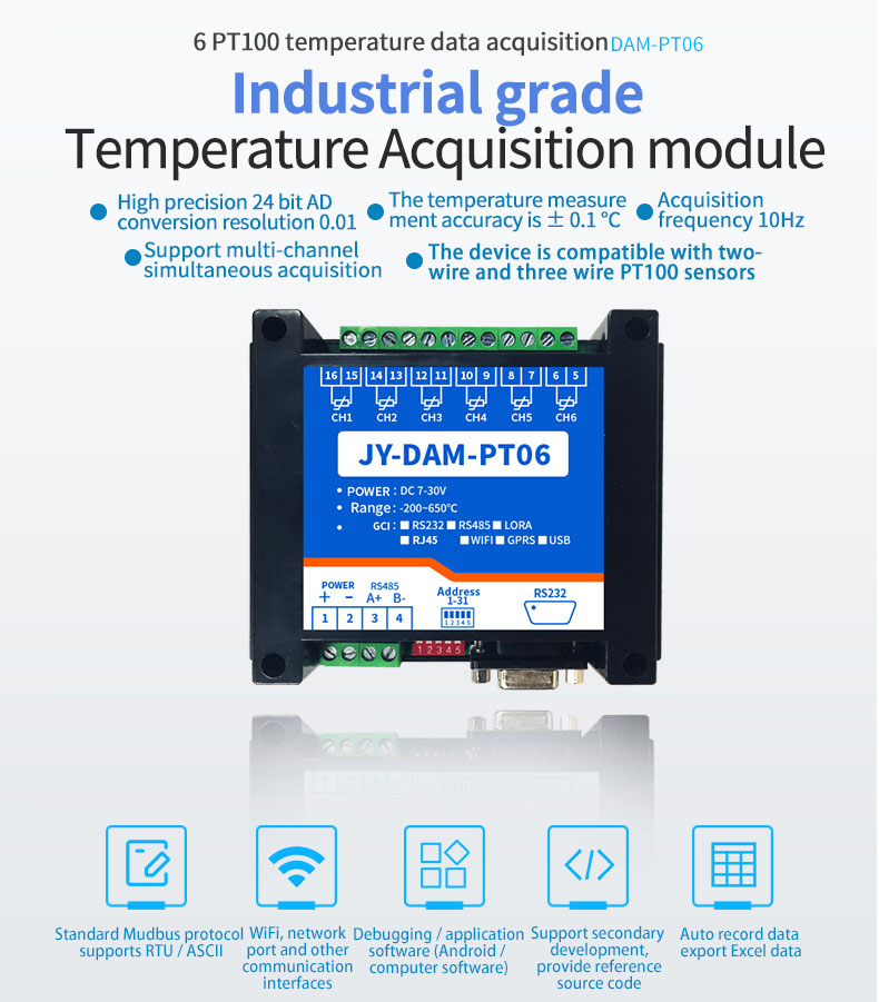 High precision 24 bit AD conversion resolution 0.01The temperature measure ment accuracy is 0.1℃Acquisition frequency 10HzSupport multi-channel simultaneous acquisitionThe device is compatible with twowire and three wire PT100 sensors
