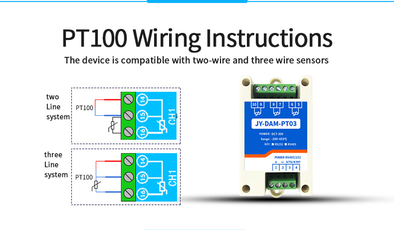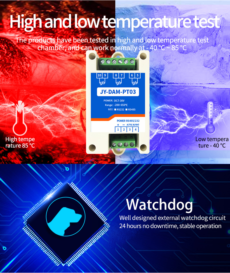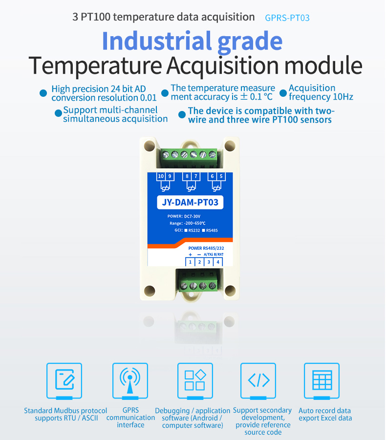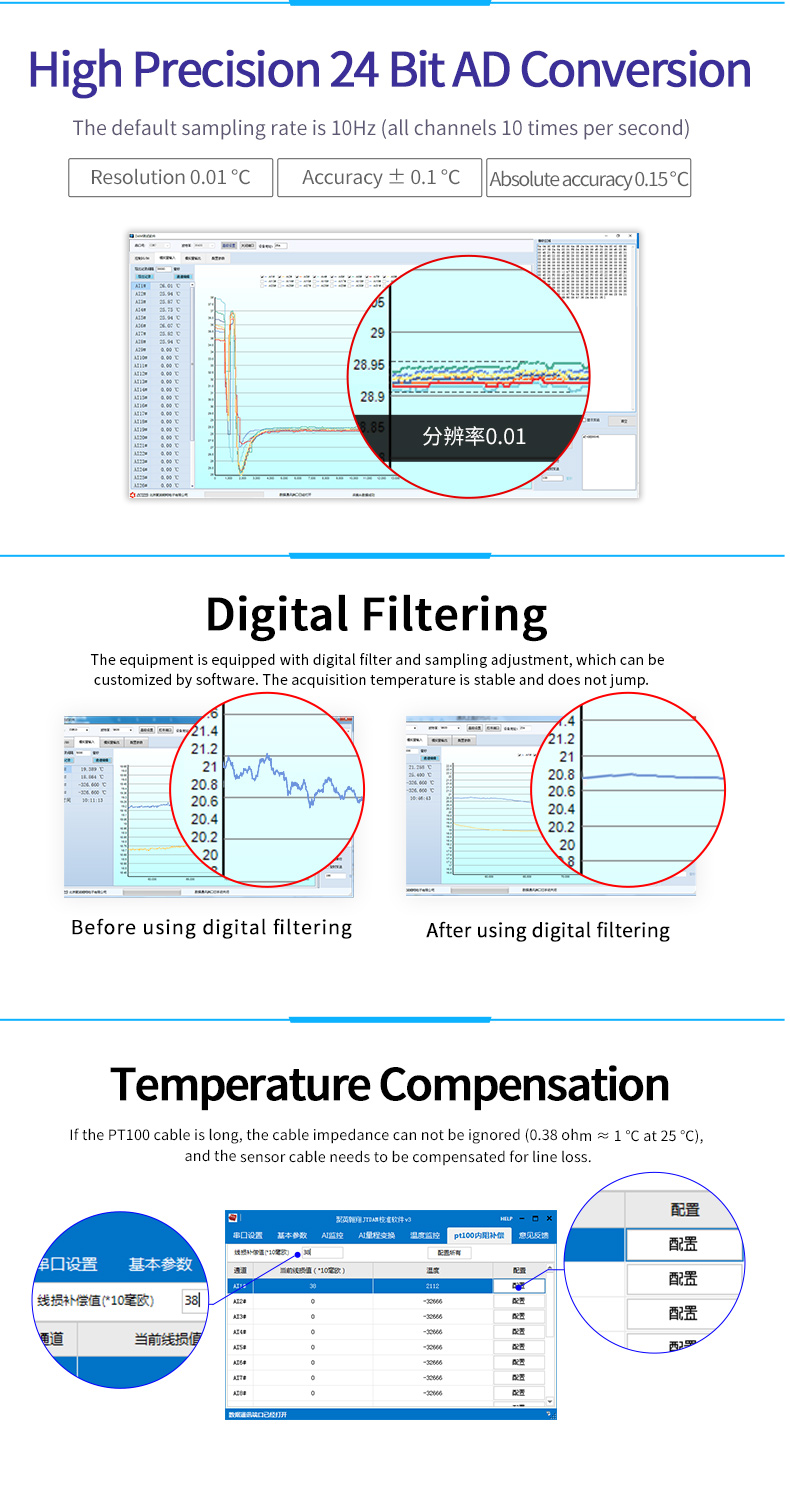 High precision 24 bit AD conversion resolution 0.01The temperature measure ment accuracy is 0.1℃Acquisition frequency 10HzSupport multi-channel simultaneous acquisitionThe device is compatible with twowire and three wire PT100 sensors
