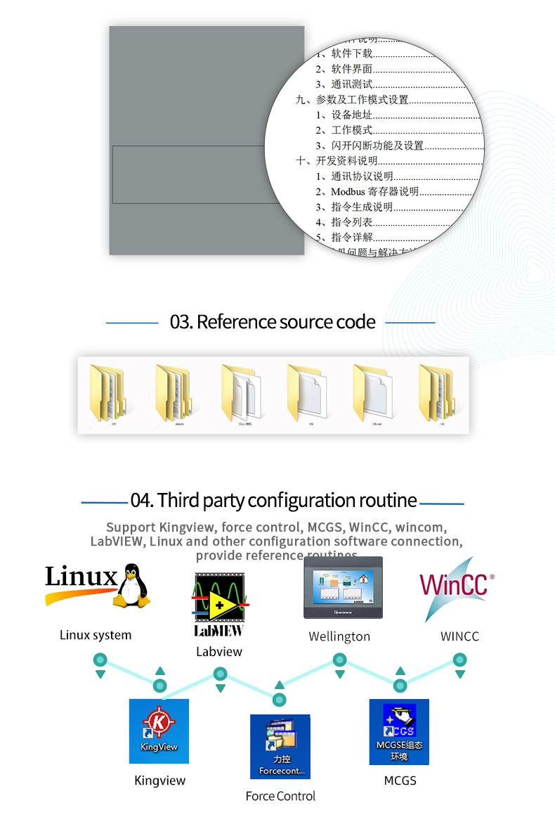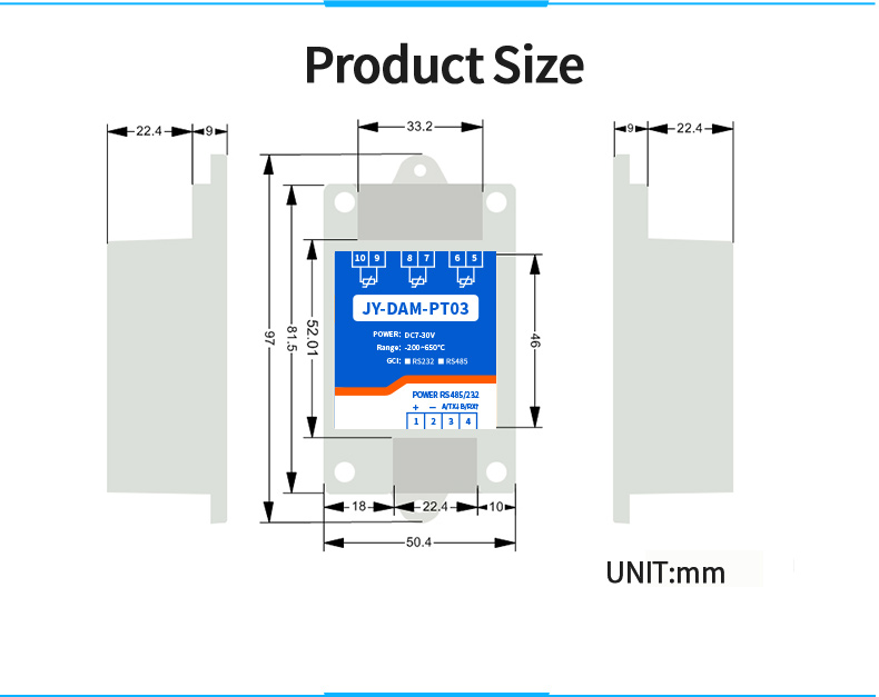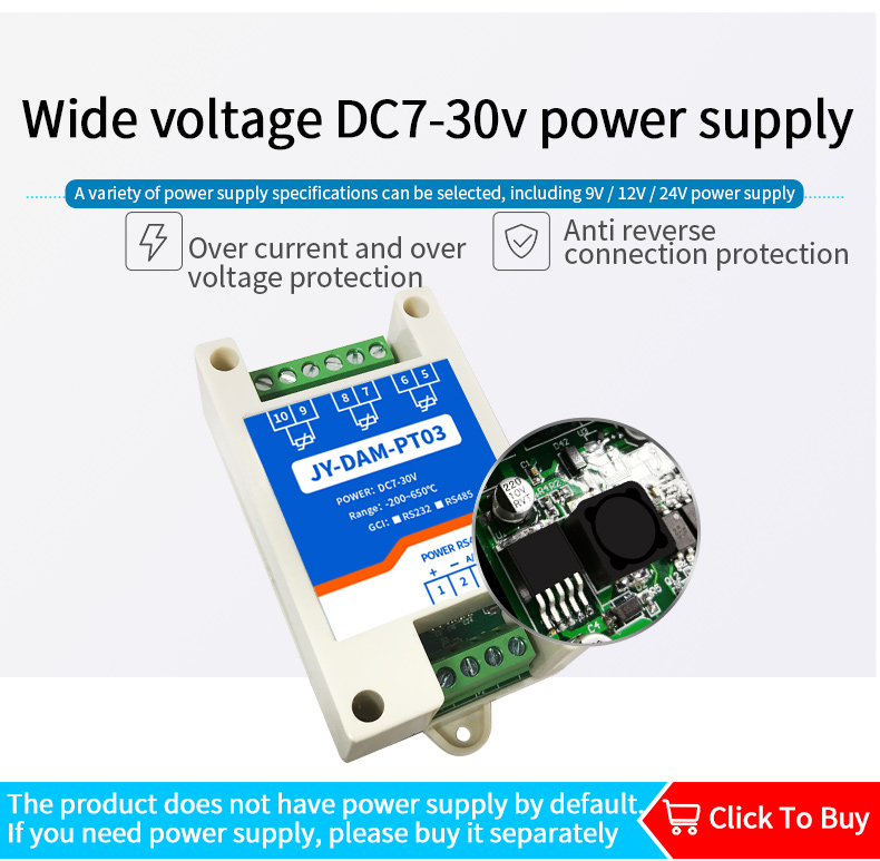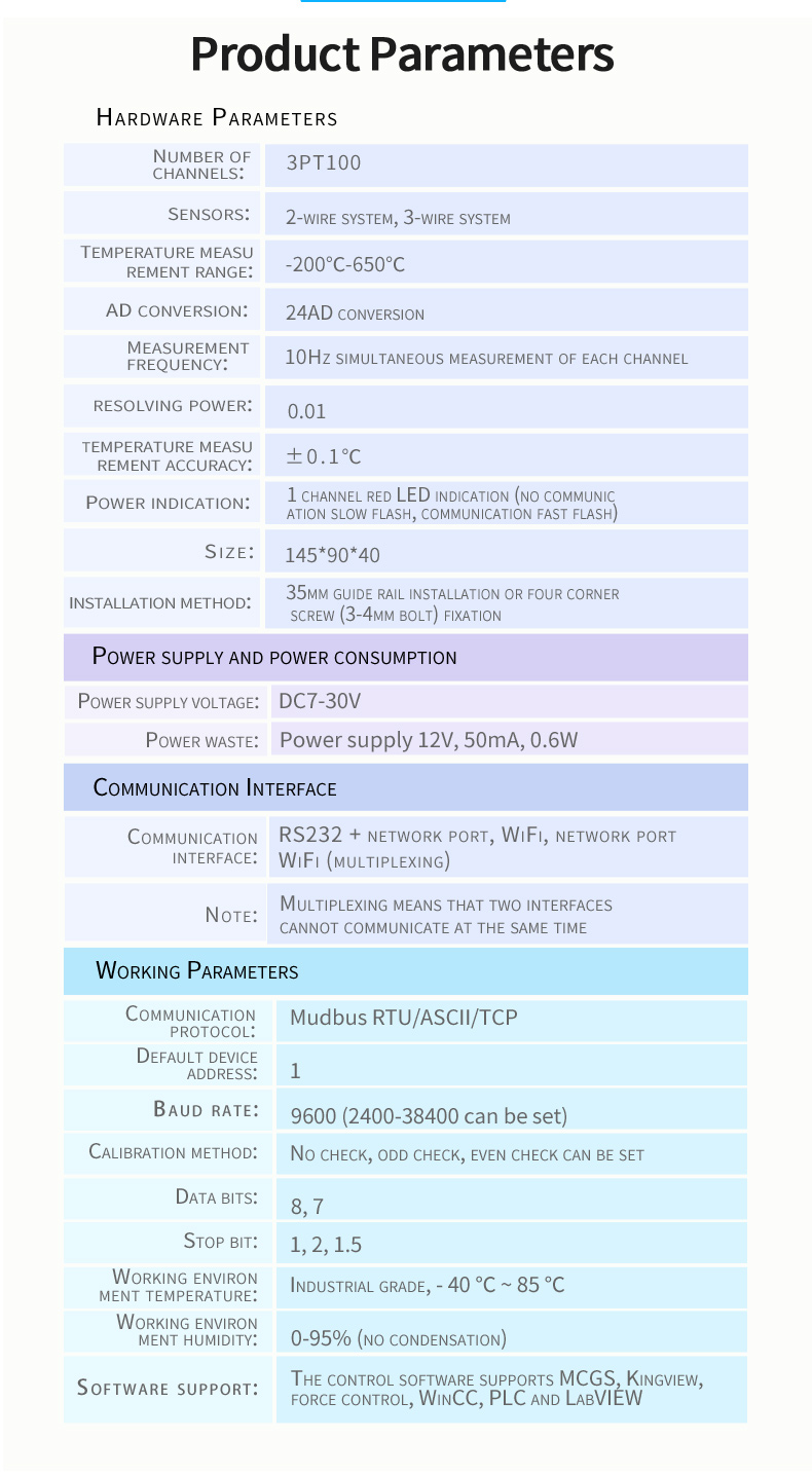 High precision 24 bit AD conversion resolution 0.01The temperature measure ment accuracy is 0.1℃Acquisition frequency 10HzSupport multi-channel simultaneous acquisitionThe device is compatible with twowire and three wire PT100 sensors
