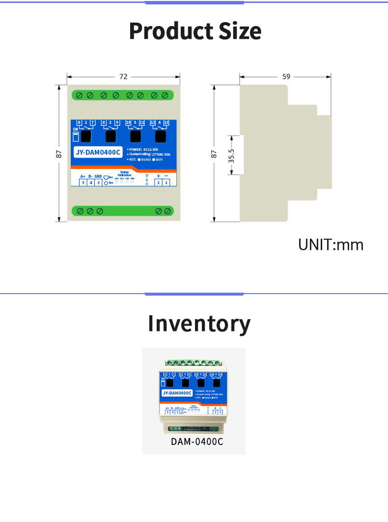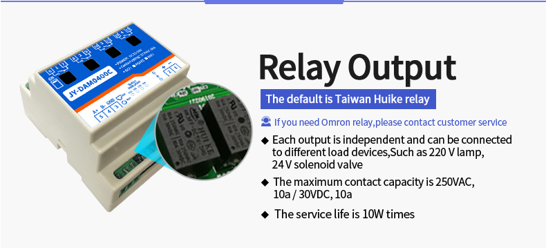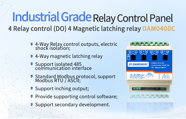 Industrial network control module 4-way relay output (do) dam0400c, 4-way magnetic holding relay control output, contact isolation; Support single WiFi; Support TCP / UDP working mode; Provide Android mobile app control software and computer web page control i...
