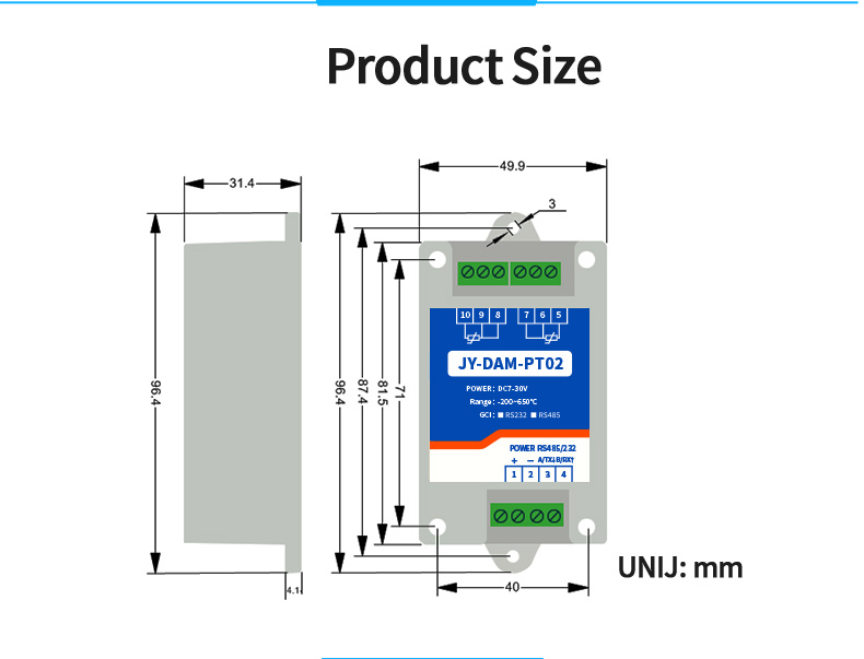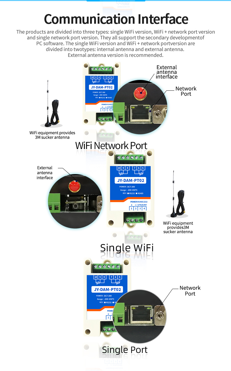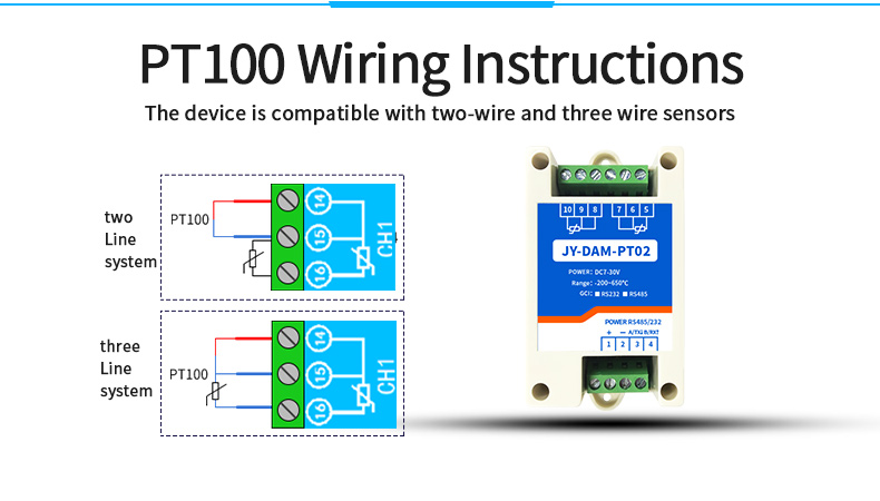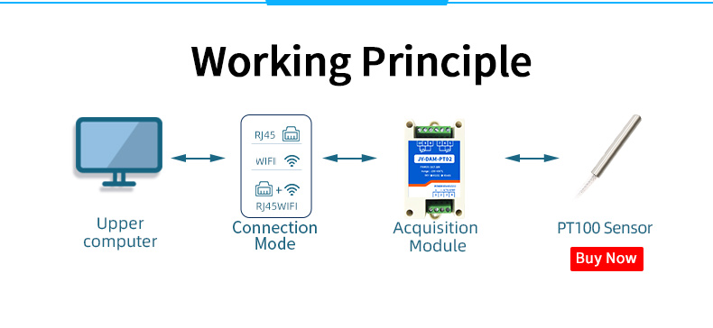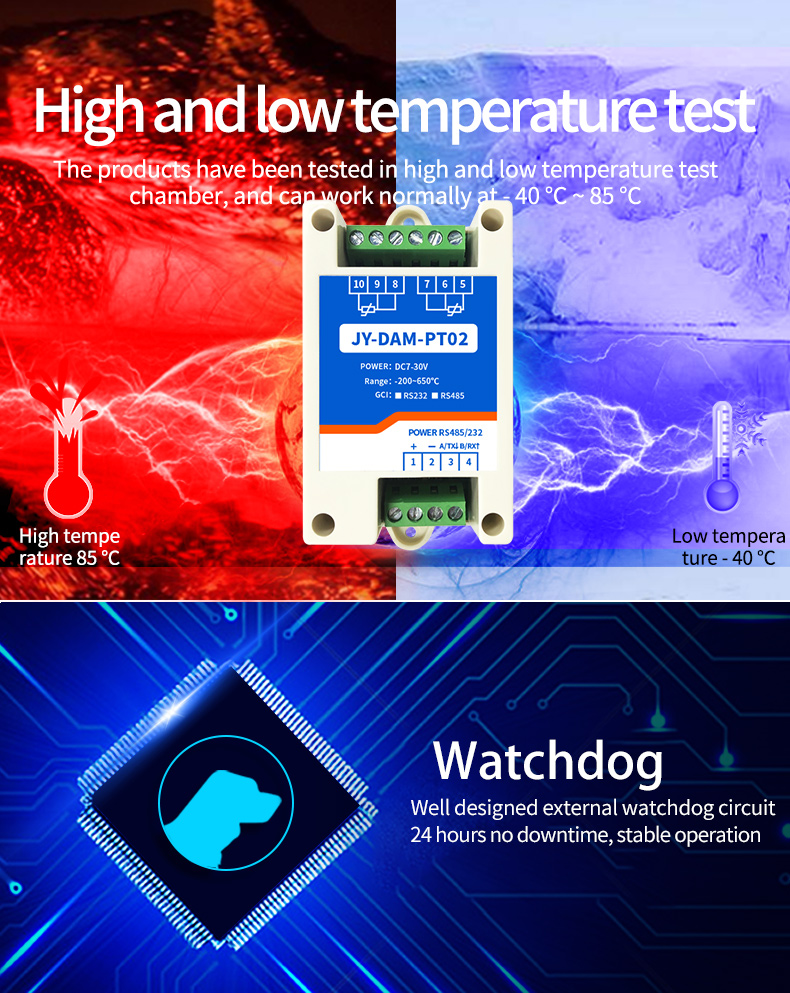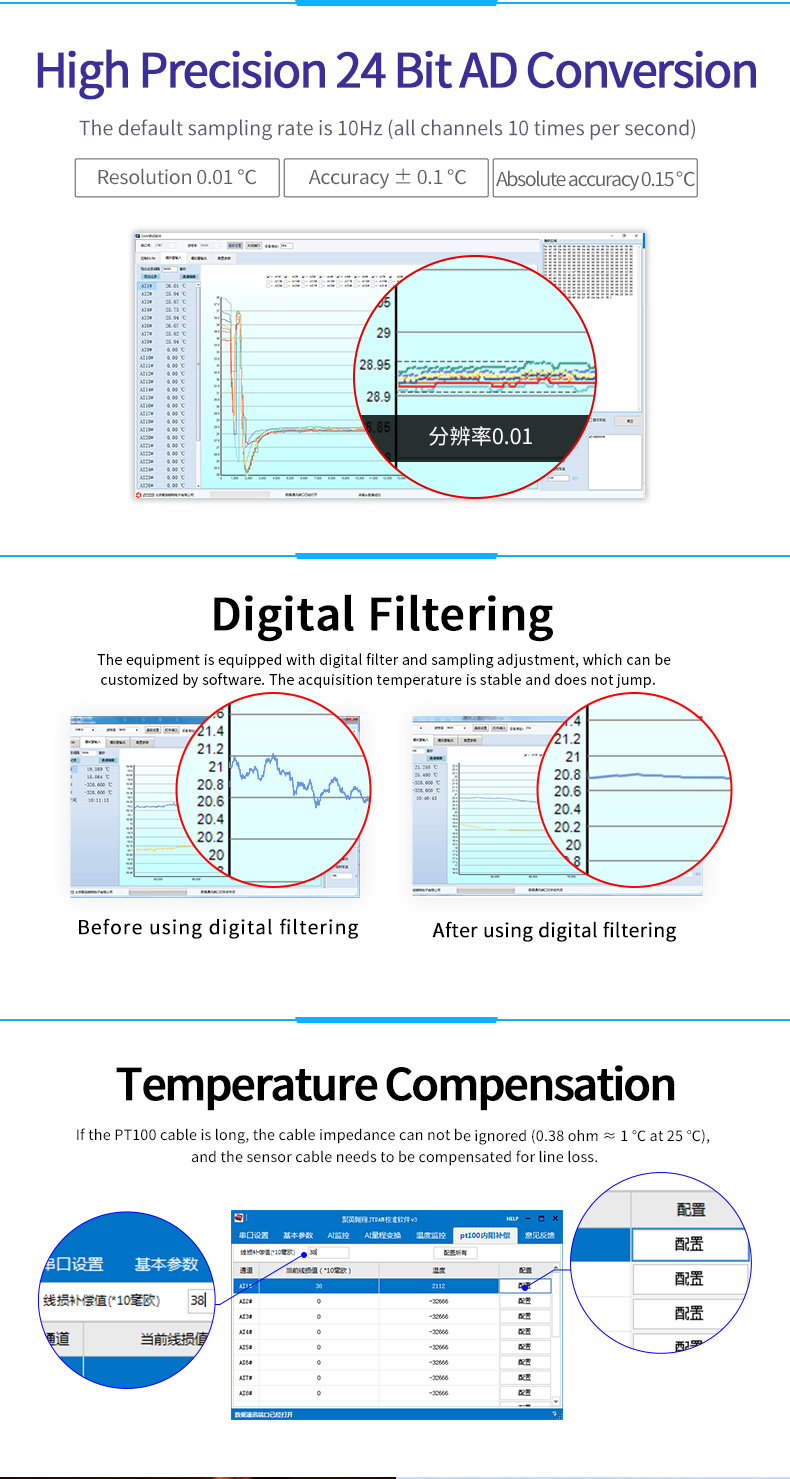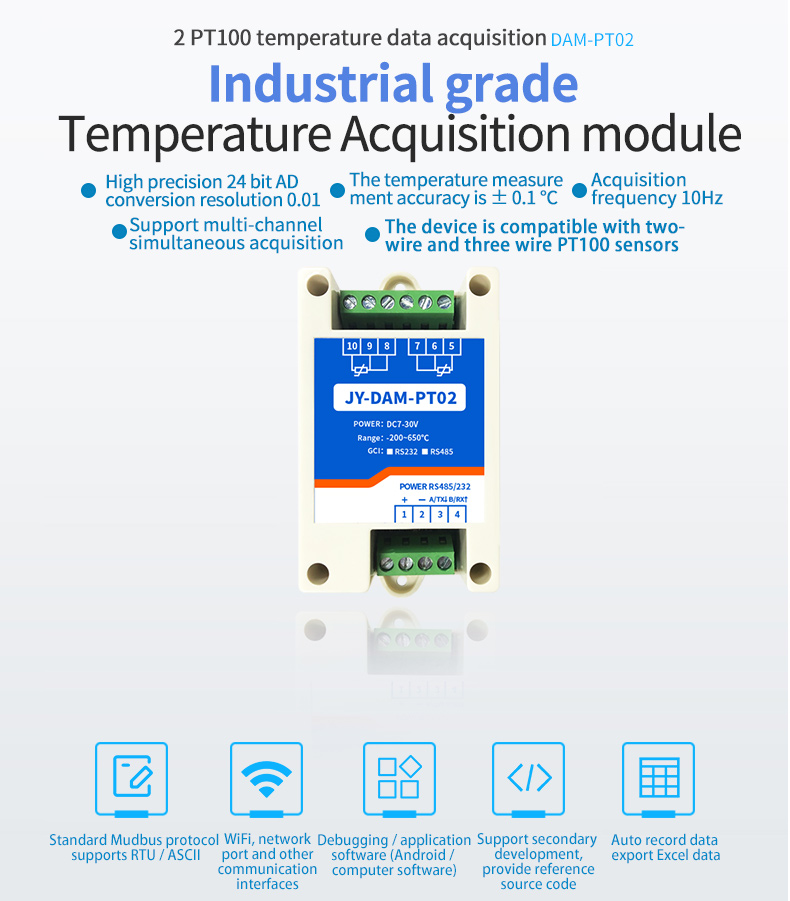 High precision 24 bit AD conversion resolution 0.01The temperature measure ment accuracy is 0.1℃Acquisition frequency 10HzSupport multi-channel simultaneous acquisitionThe device is compatible with twowire and three wire PT100 sensors