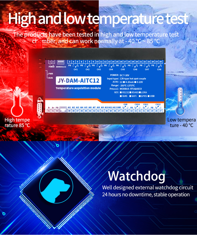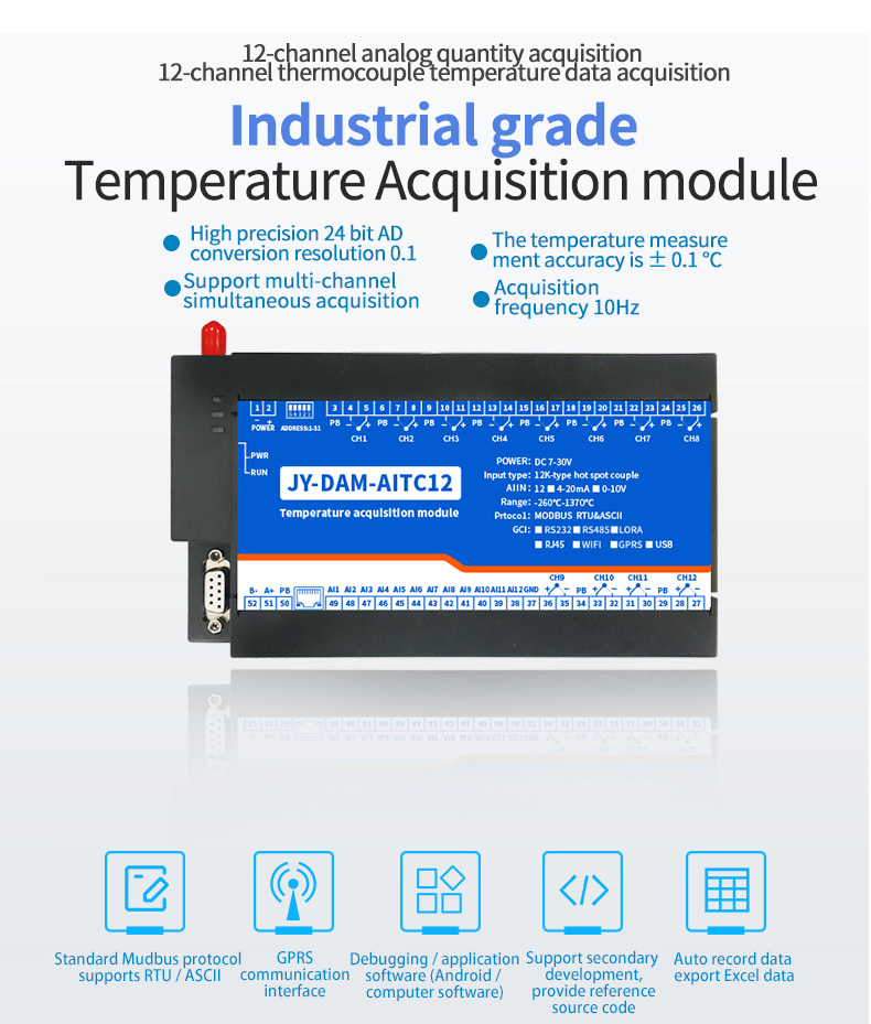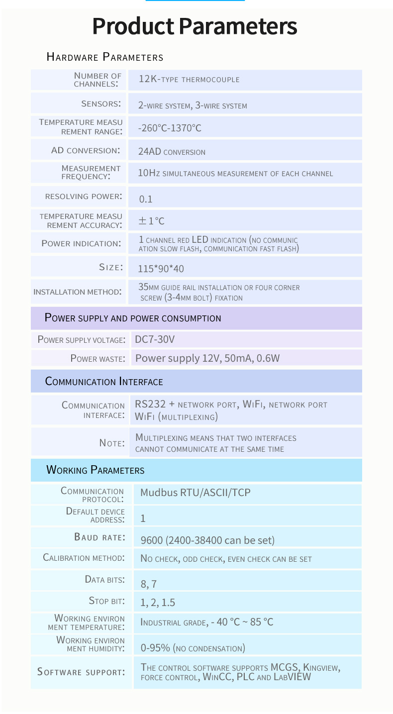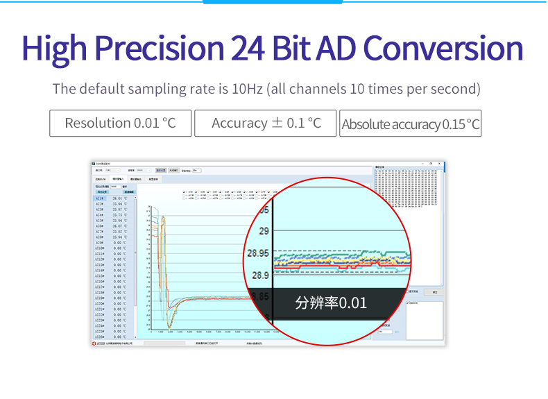 High precision 24 bit AD conversion resolution 0.01The temperature measure ment accuracy is 0.1℃Acquisition frequency 10HzSupport multi-channel simultaneous acquisitionThe device is compatible with twowire and three wire PT100 sensors