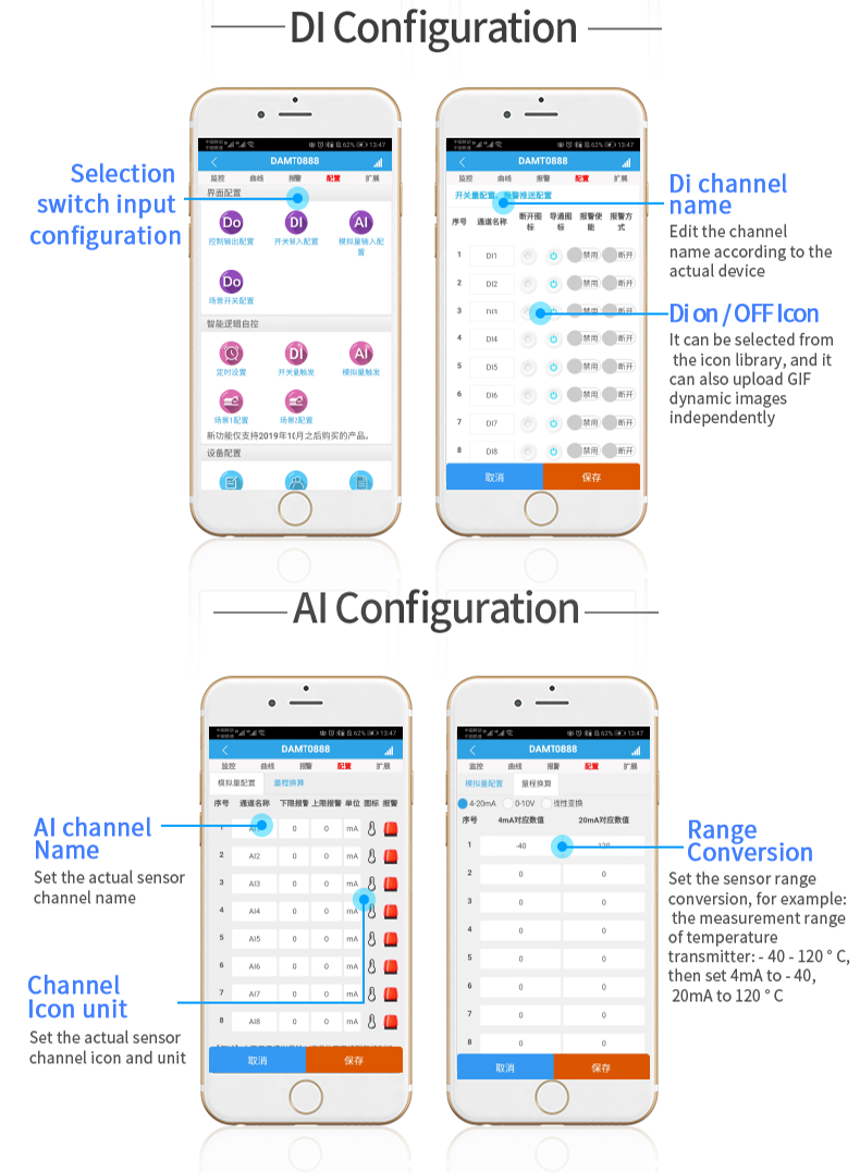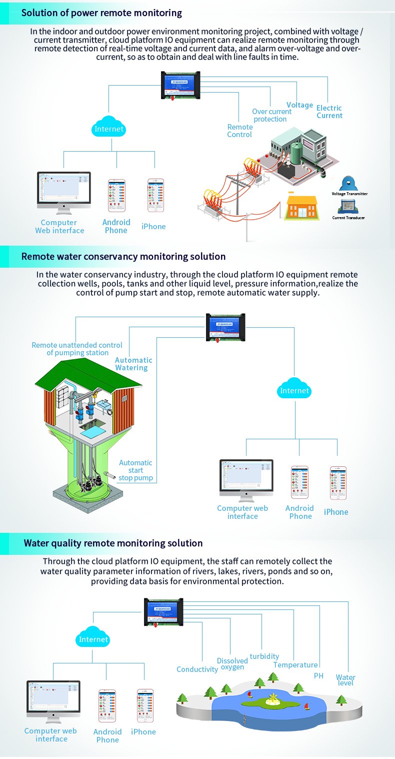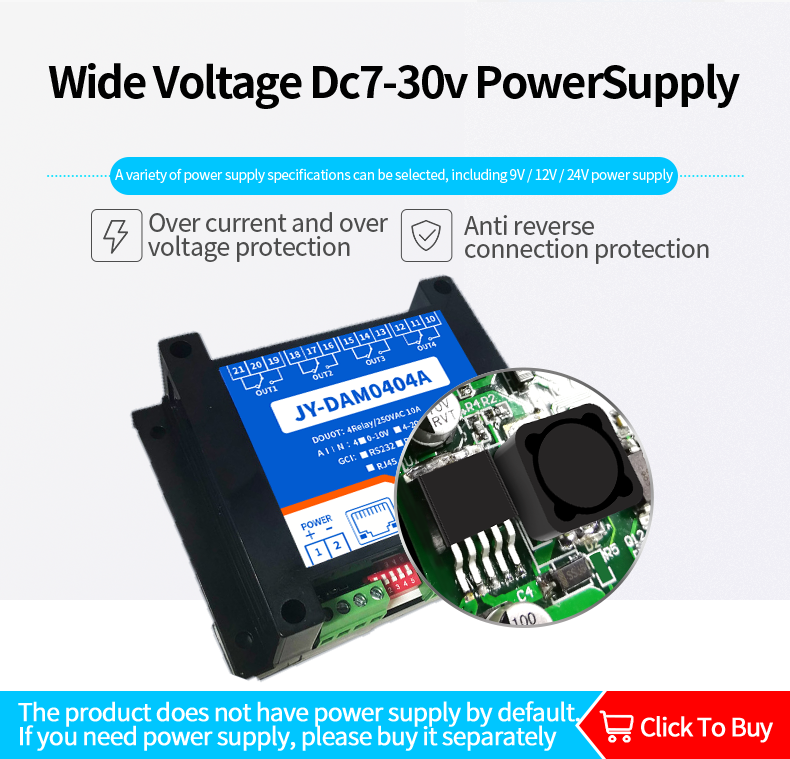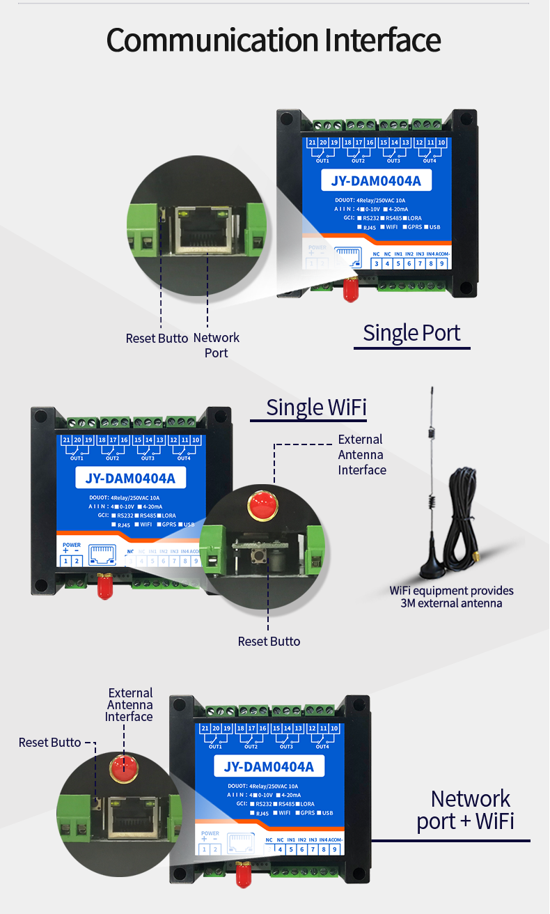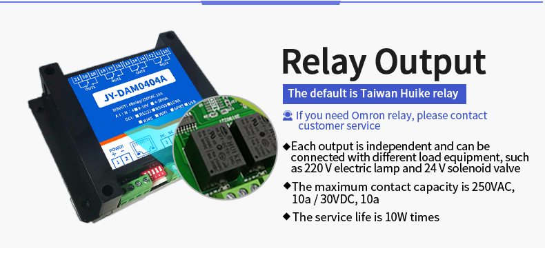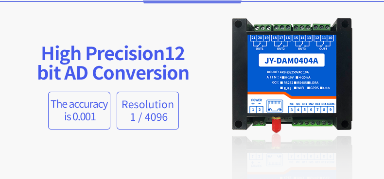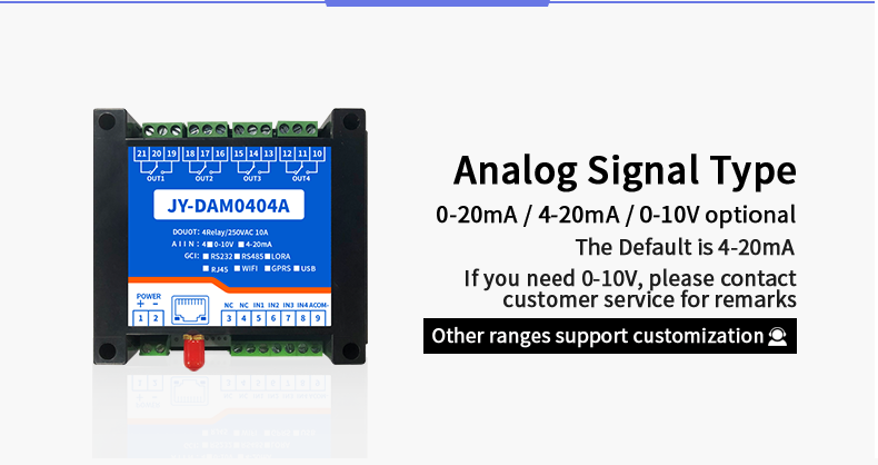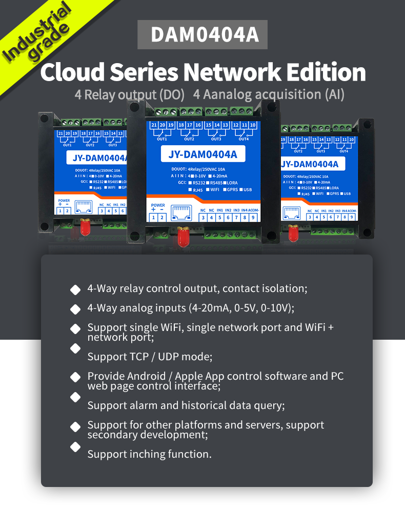 Dam0404a industrial cloud series network version, 4-way relay output (do), 4-way analog acquisition (AI), 4-way relay control output, contact isolation; 4 analog inputs (4-20mA, 0-5V, 0-10V); Support single WiFi, single network port and WiFi