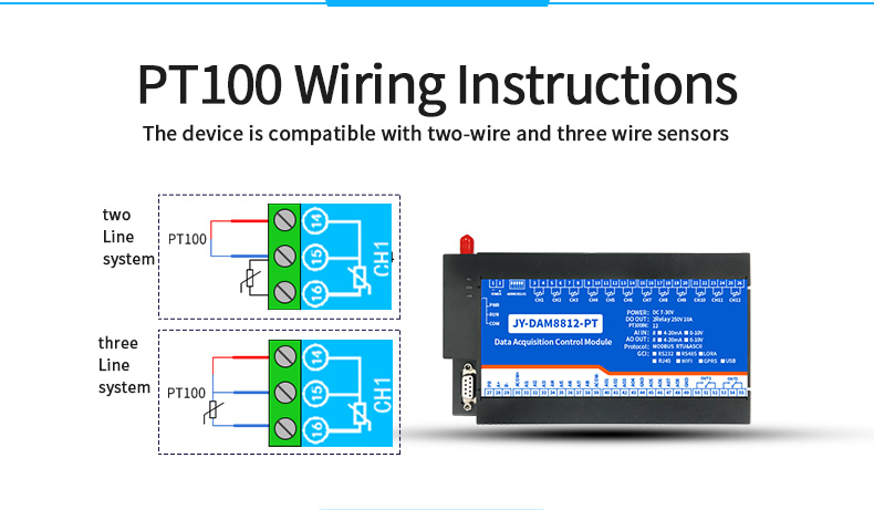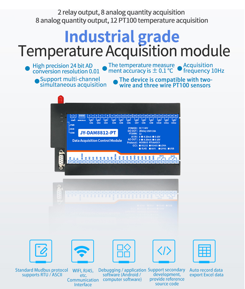 High precision 24 bit AD conversion resolution 0.01The temperature measure ment accuracy is 0.1℃Acquisition frequency 10HzSupport multi-channel simultaneous acquisitionThe device is compatible with twowire and three wire PT100 sensors