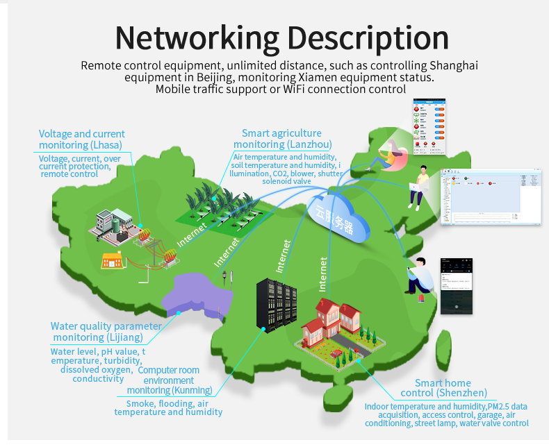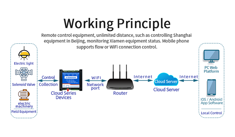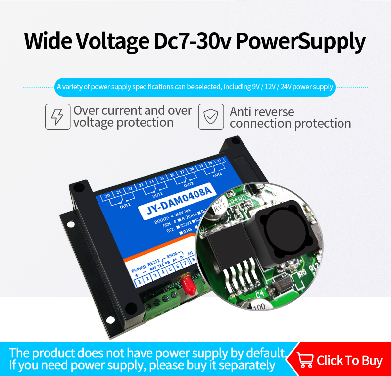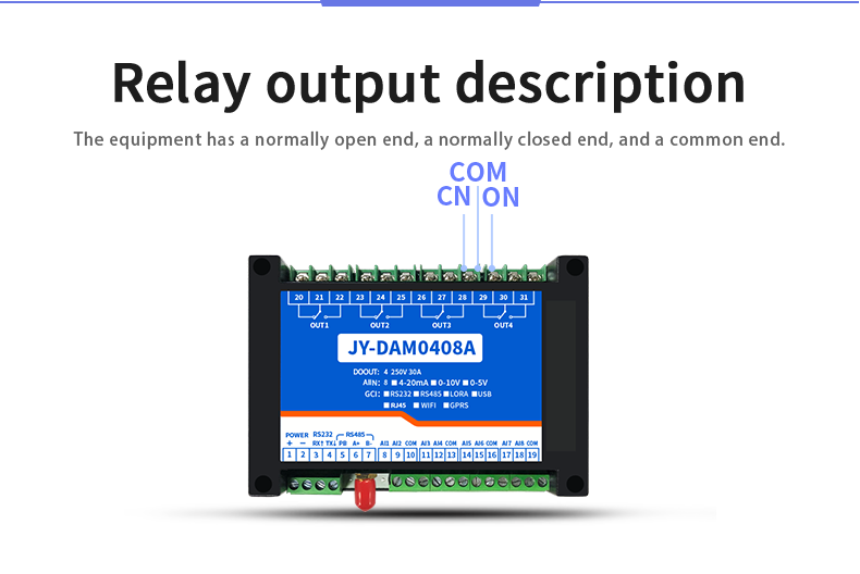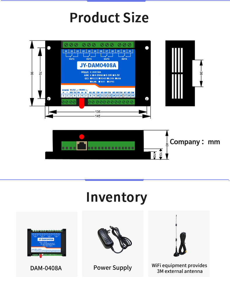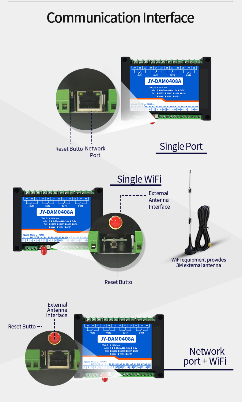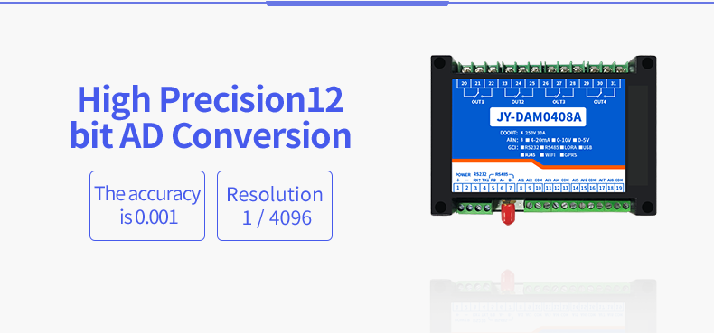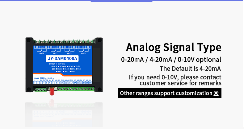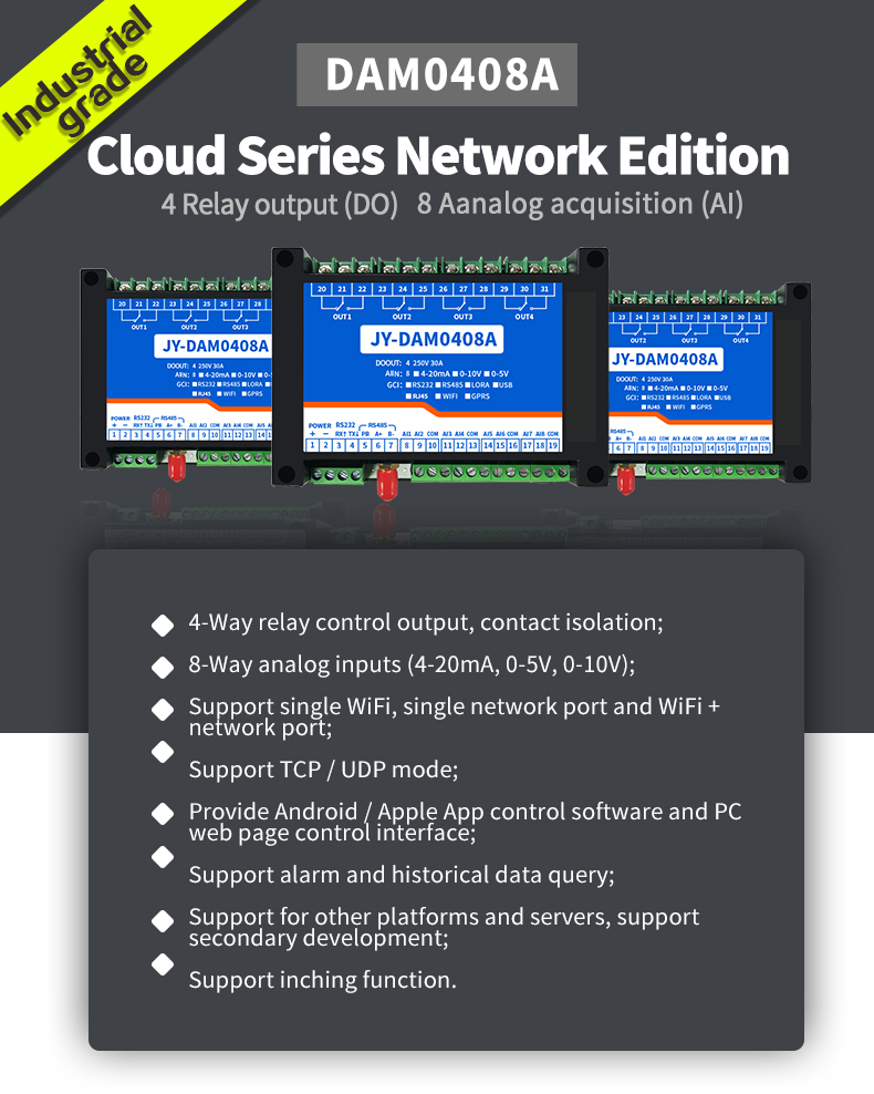 Dam-0408a industrial cloud platform series network version, 4-way switching value acquisition (DI), 8-way analog value acquisition (AI), 4-way switching value input (NPN / dry contact); 8 analog inputs (4-20mA, 0-5V, 0-10V); Support single WiFi and single netw...