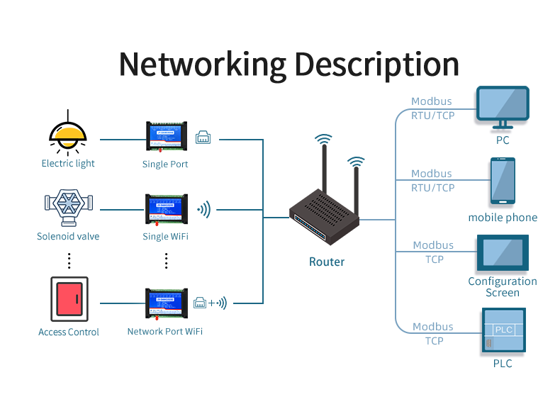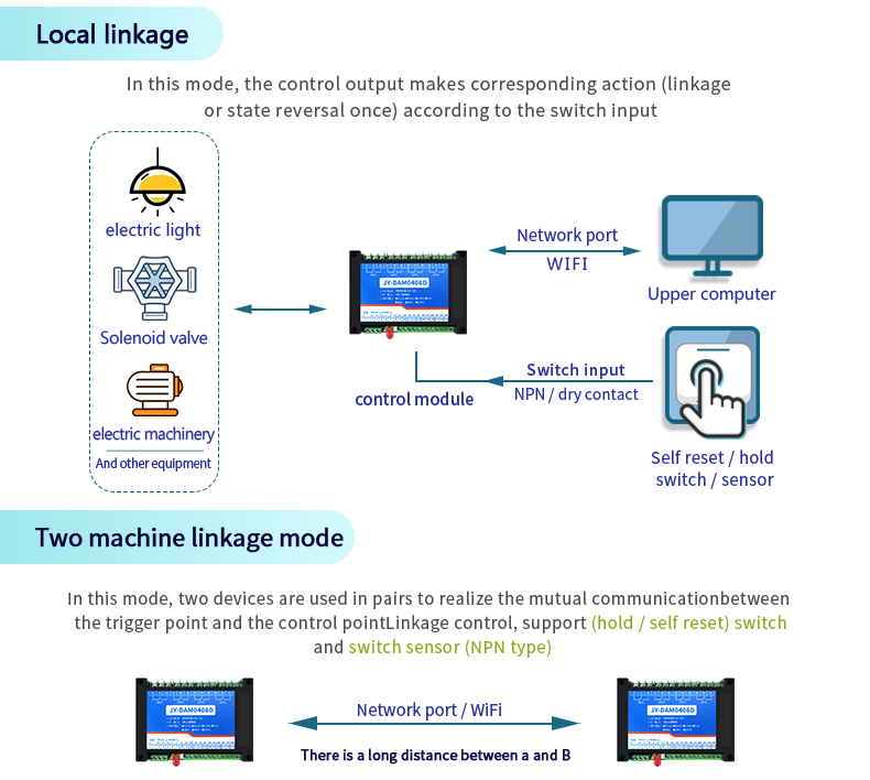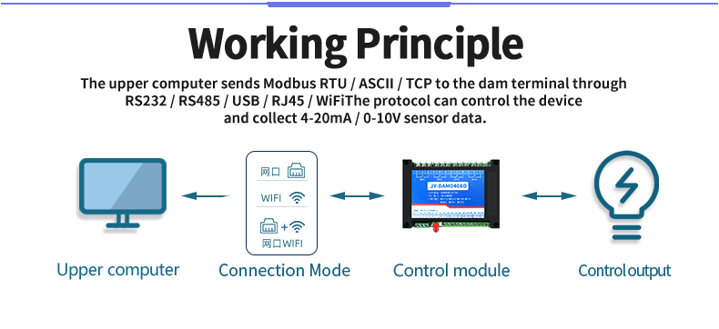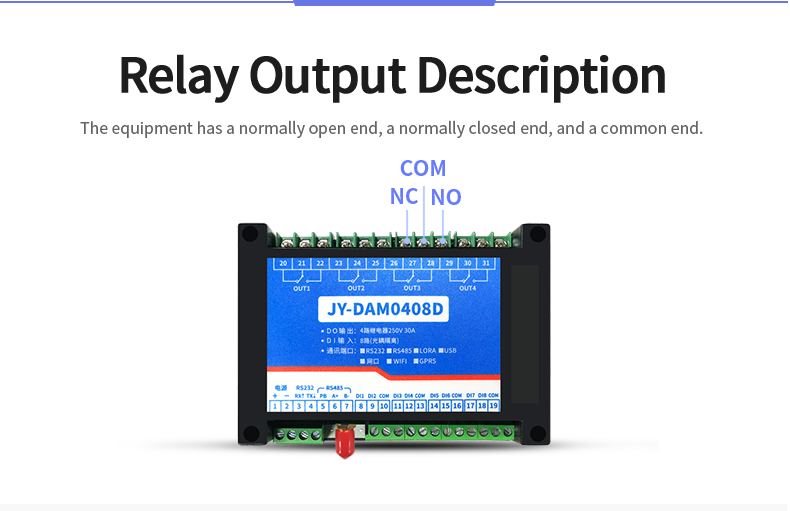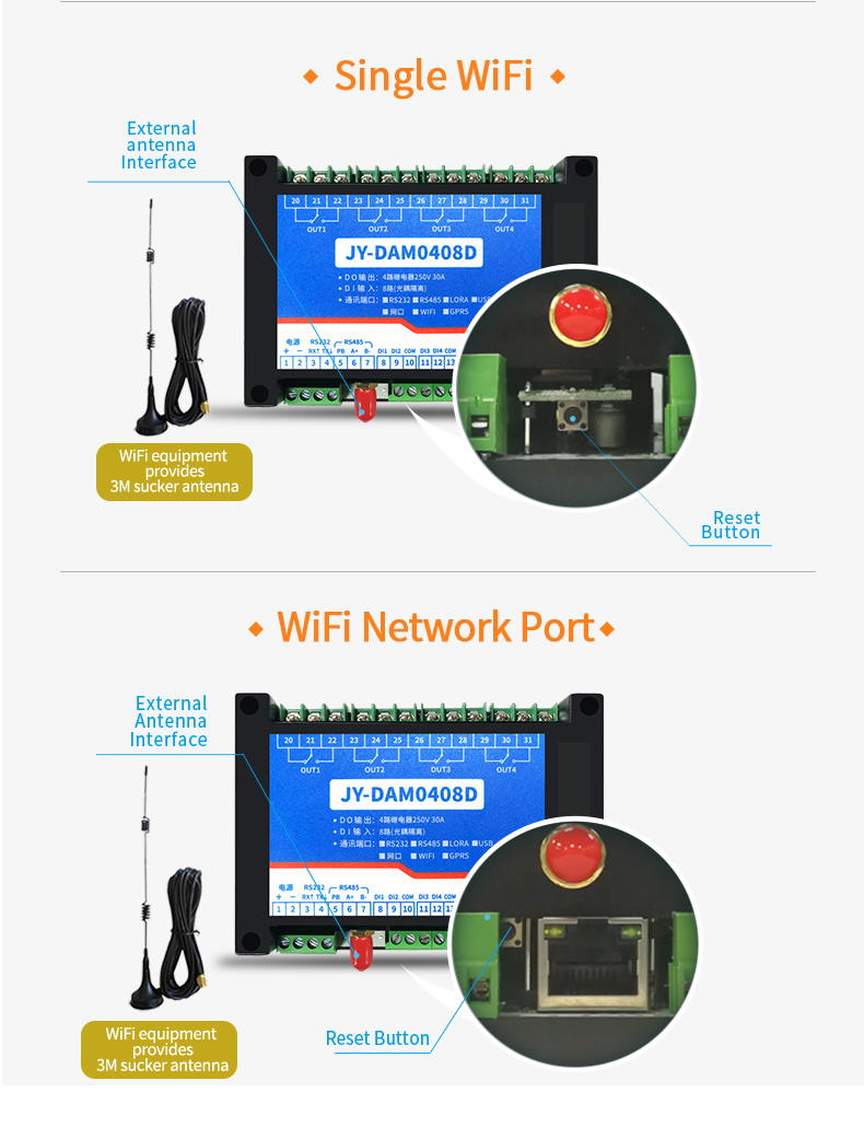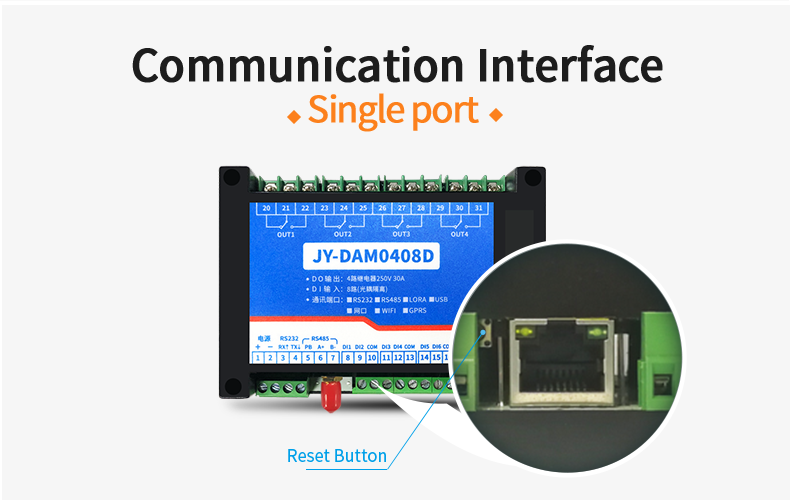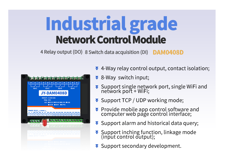 Dam0408d industrial network control module, 4-way relay output (do), 8-way switching value acquisition (DI), 4-way relay control output, contact isolation; 8-way switching value input; It supports three categories: single network port, single WiFi and network ...