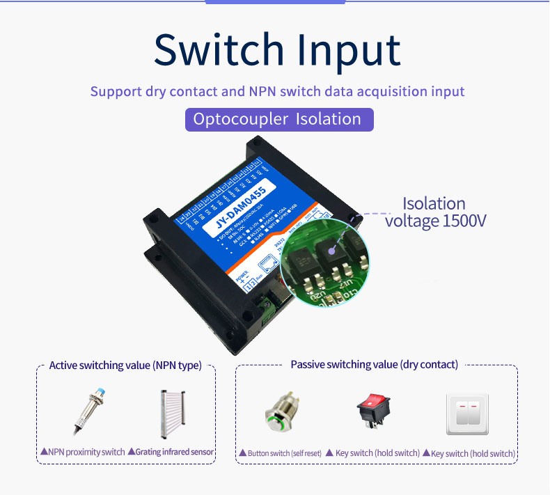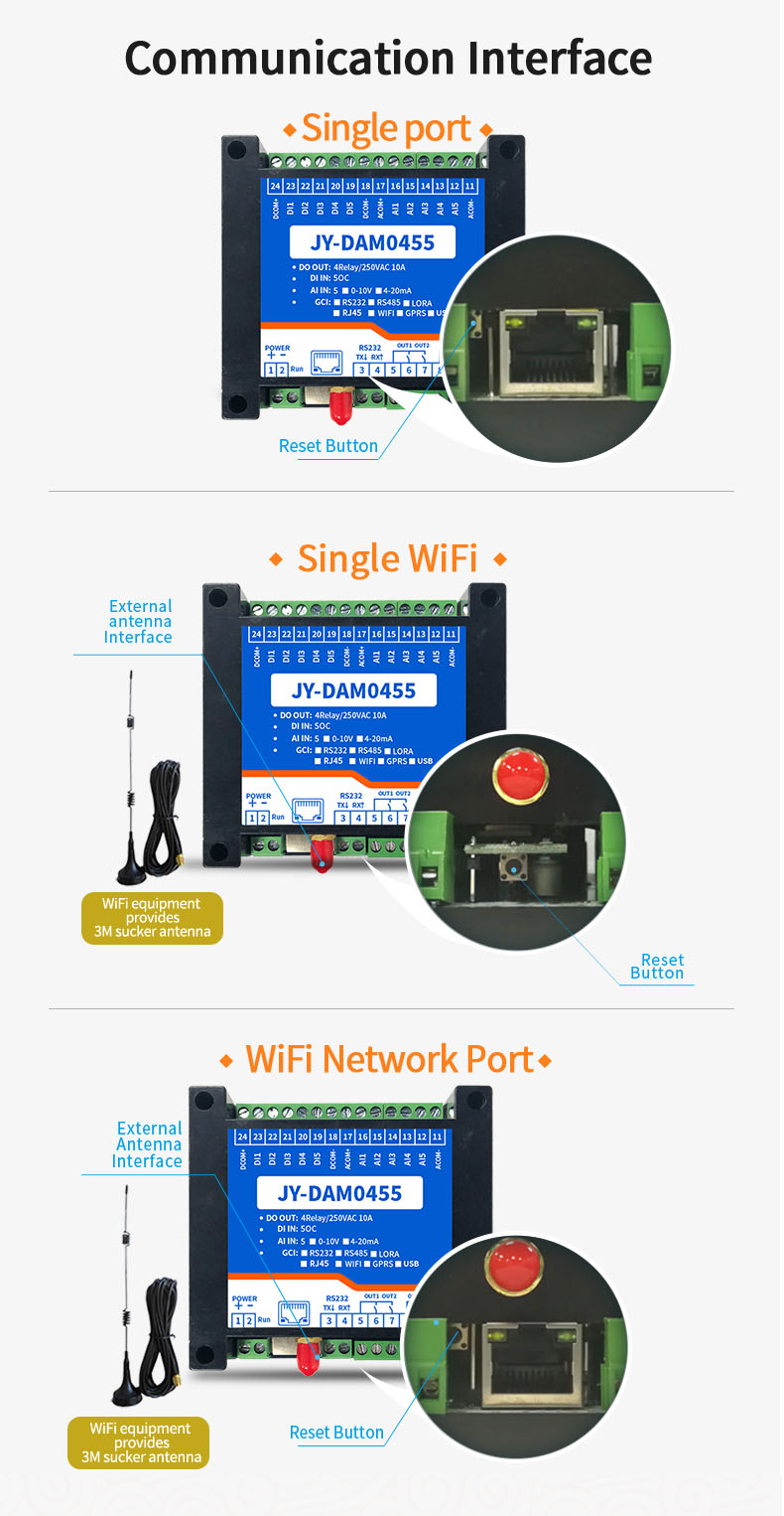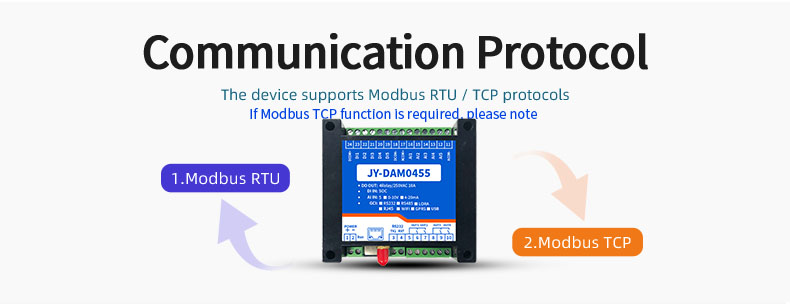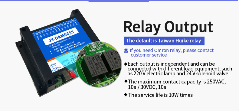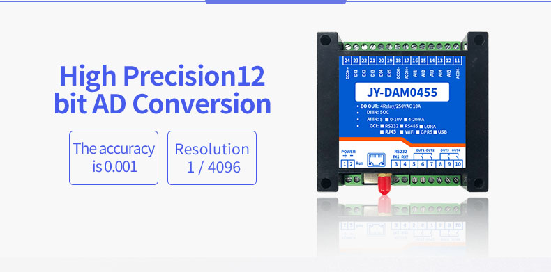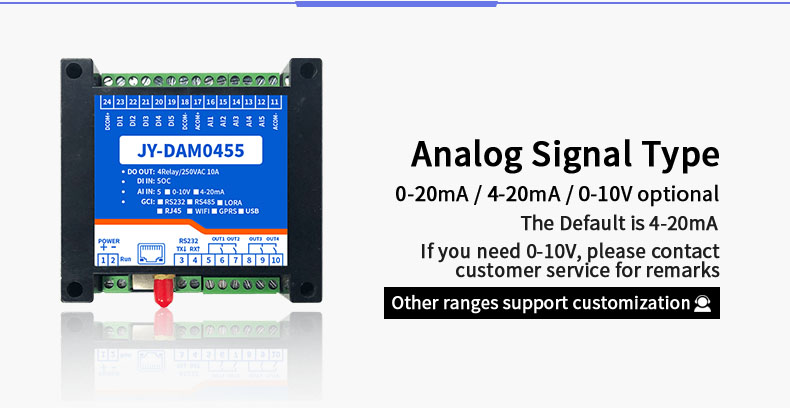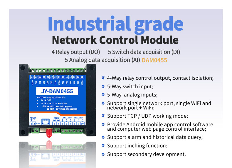 Dam0455 industrial network control module, 4-way relay output (do), 5-way switching value acquisition (DI), 5-way analog value acquisition (AI), 4-way relay control output, contact isolation; 5-way switching value input; 5 analog inputs; Support single network...