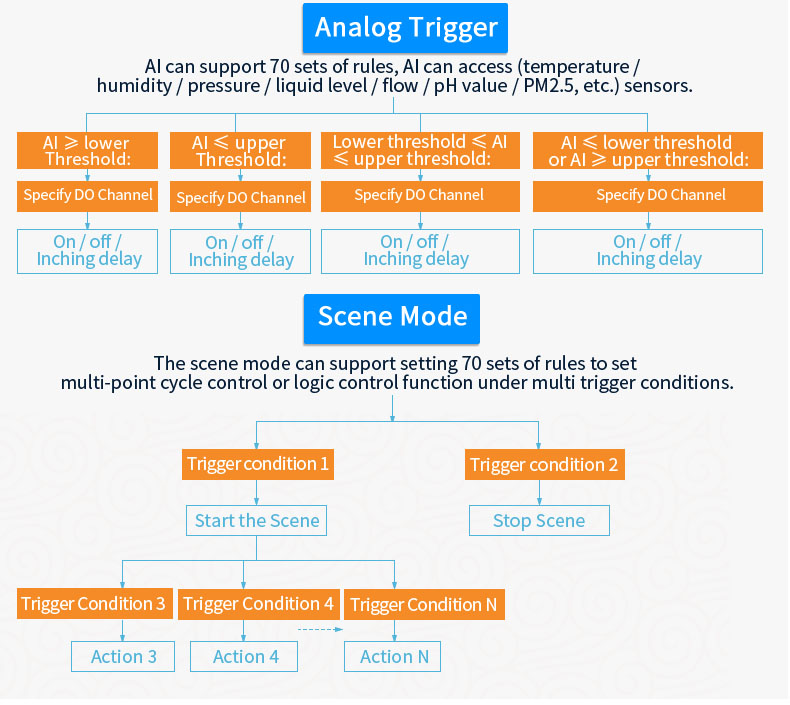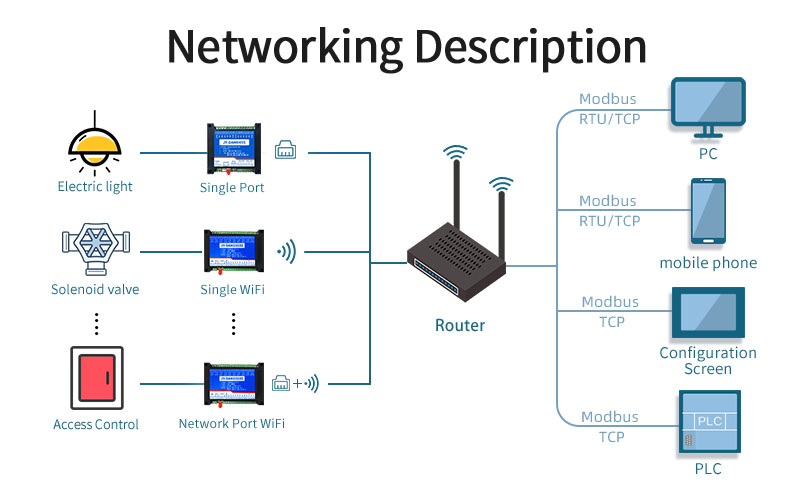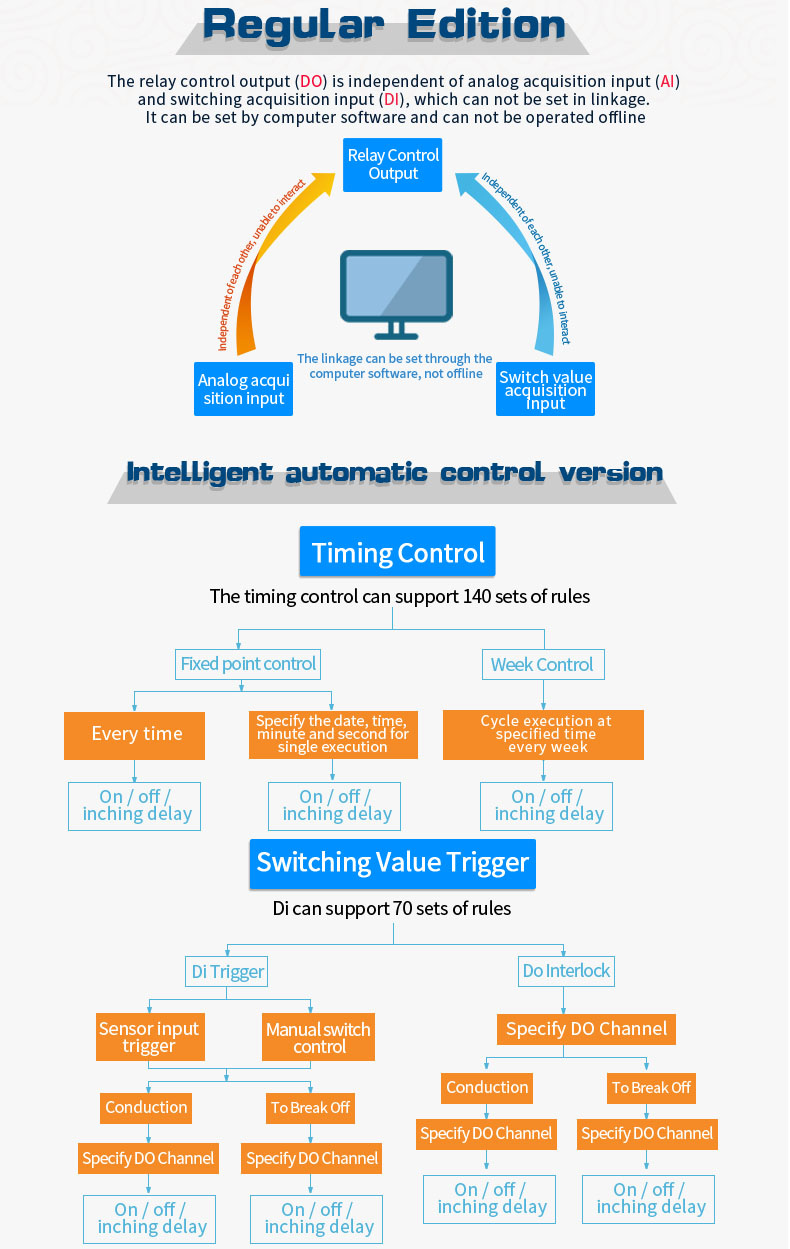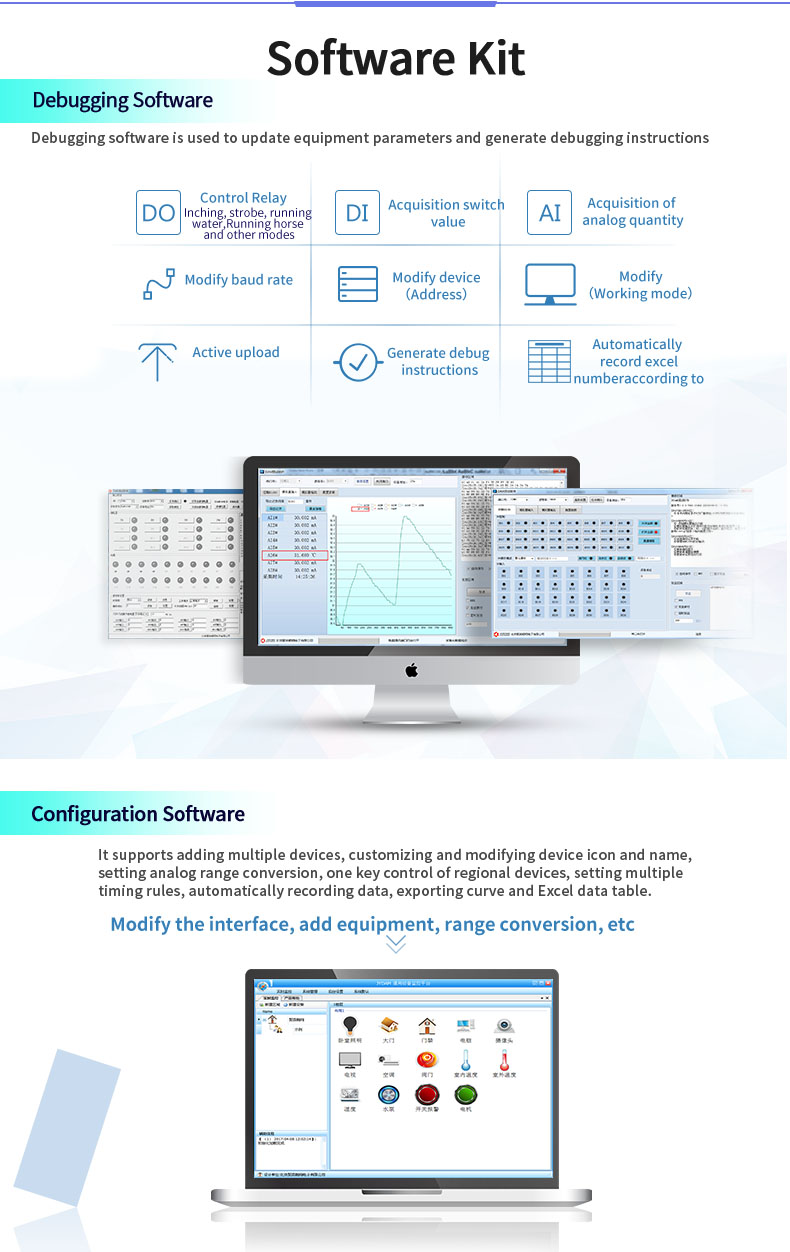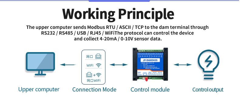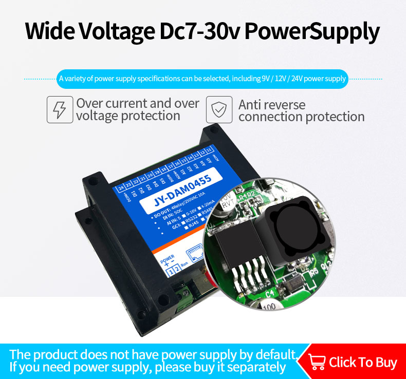 Dam0455 industrial network control module, 4-way relay output (do), 5-way switching value acquisition (DI), 5-way analog value acquisition (AI), 4-way relay control output, contact isolation; 5-way switching value input; 5 analog inputs; Support single network...