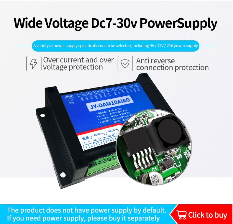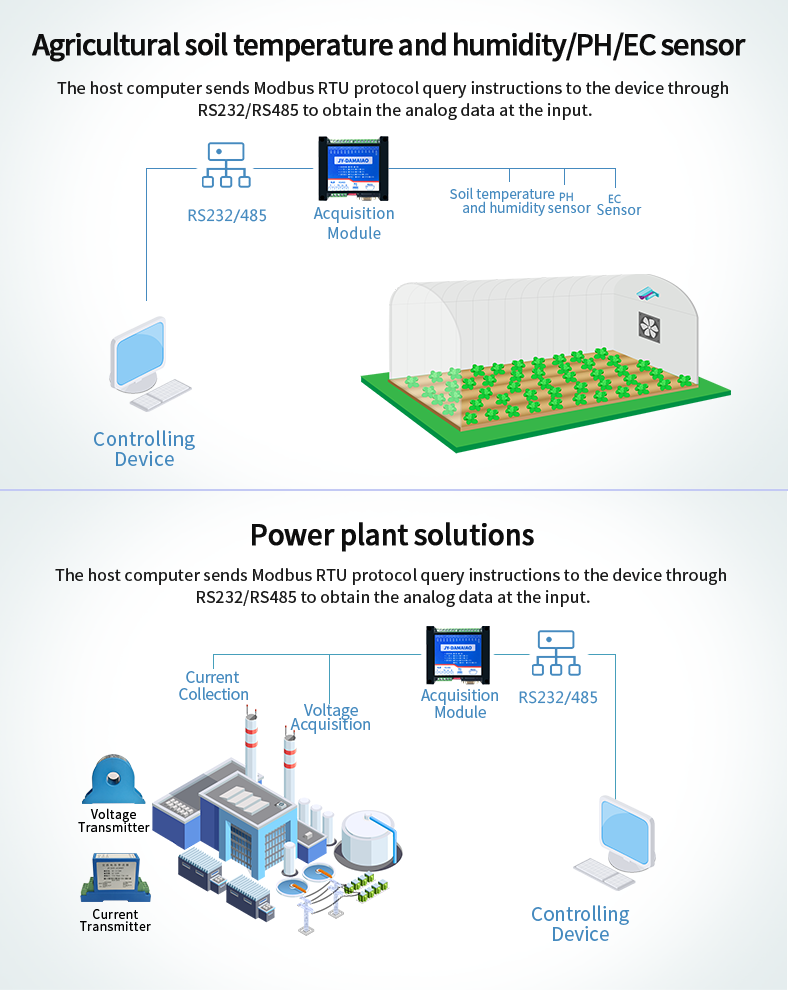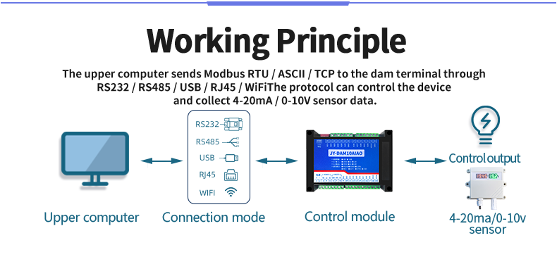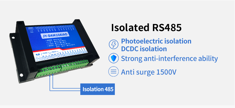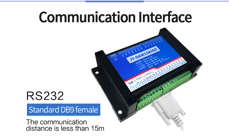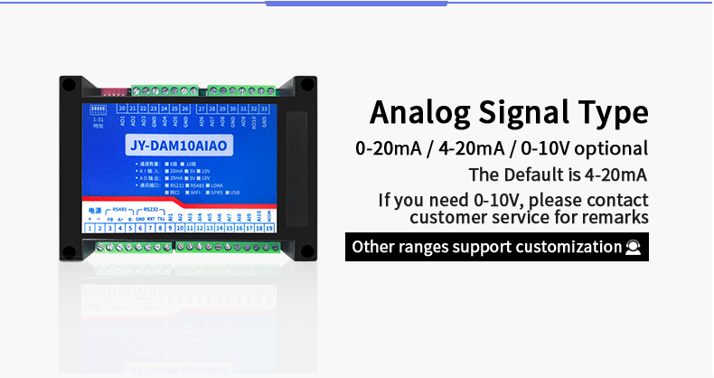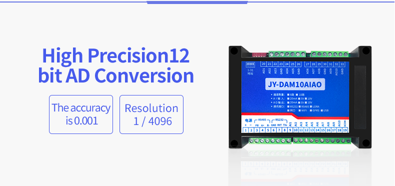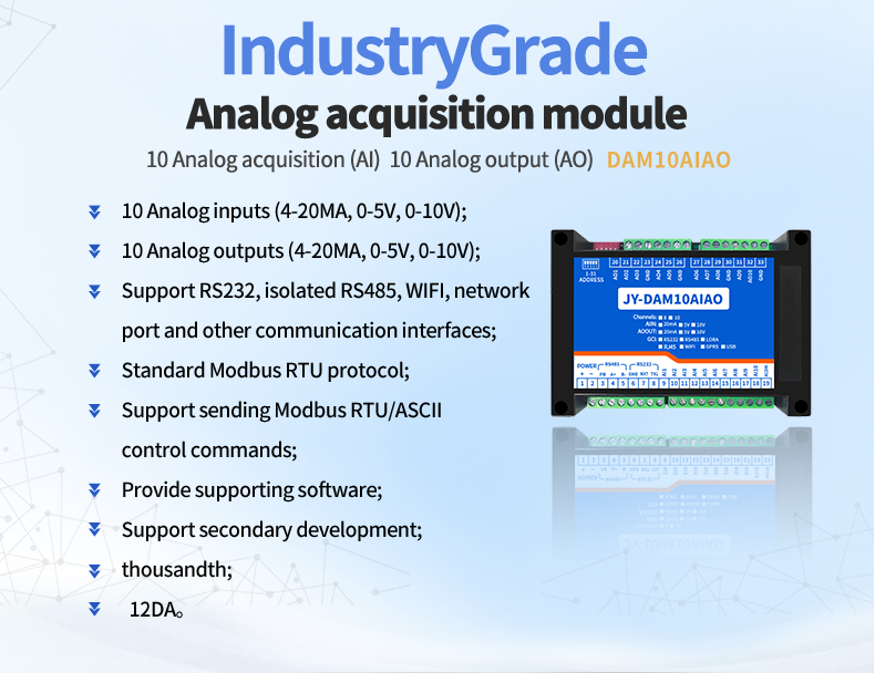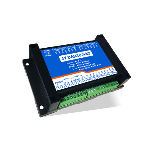 Industrial analog acquisition module, 10 analog inputs (4-20mA, 0-5V, 0-10V); 10 analog outputs (4-20mA, 0-5V, 0-10V); Support RS232, isolated RS485, WiFi, network port and other communication interfaces;