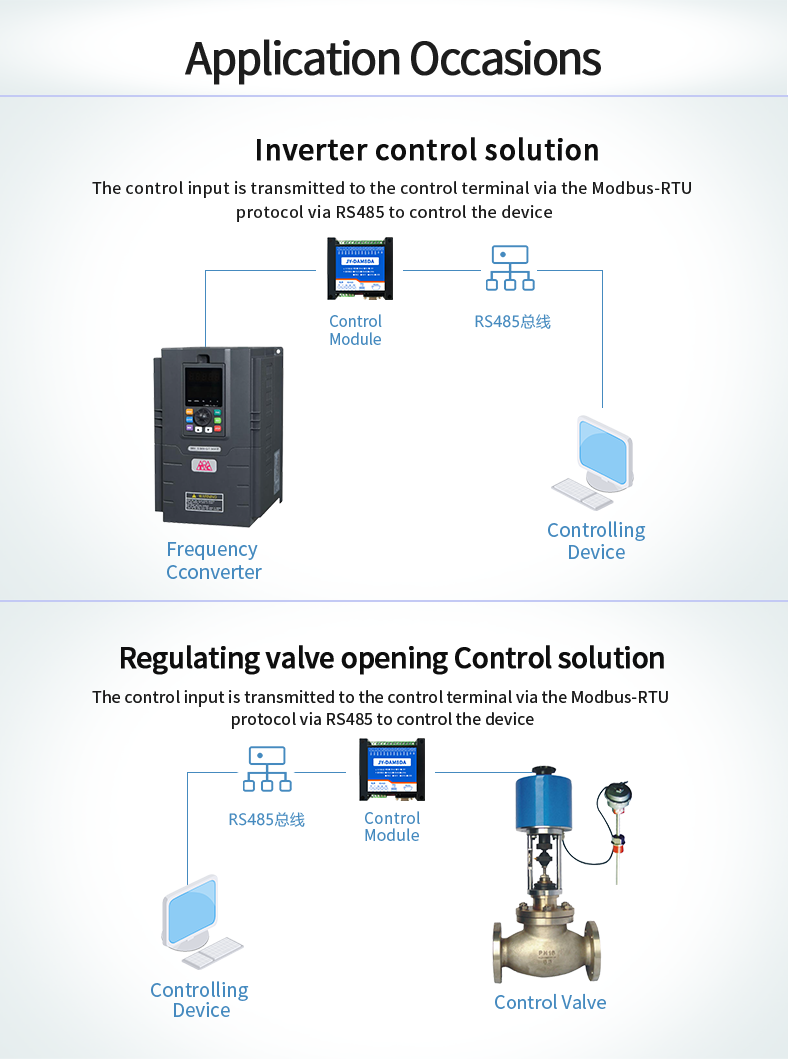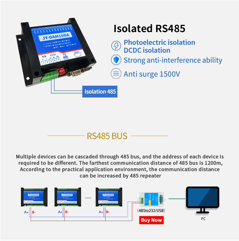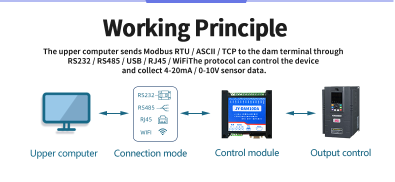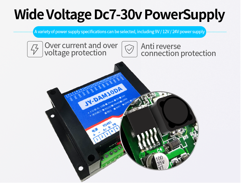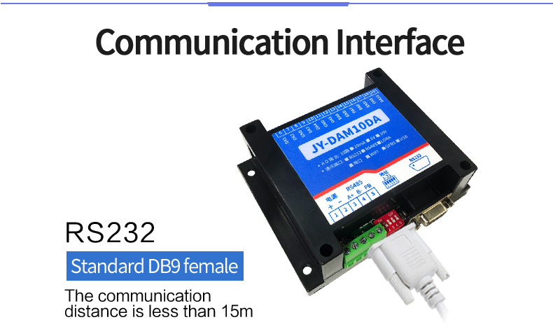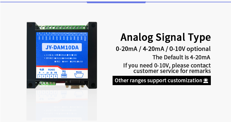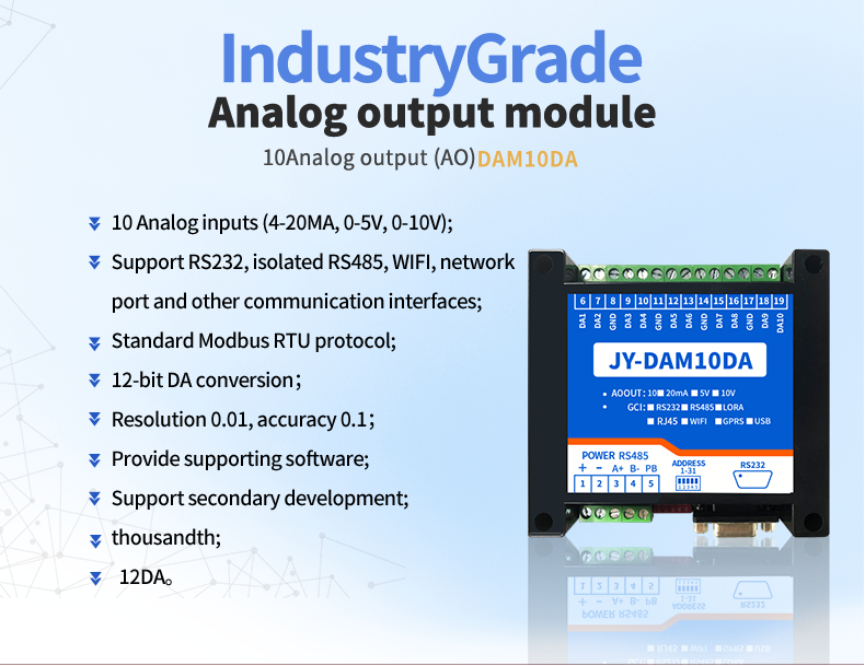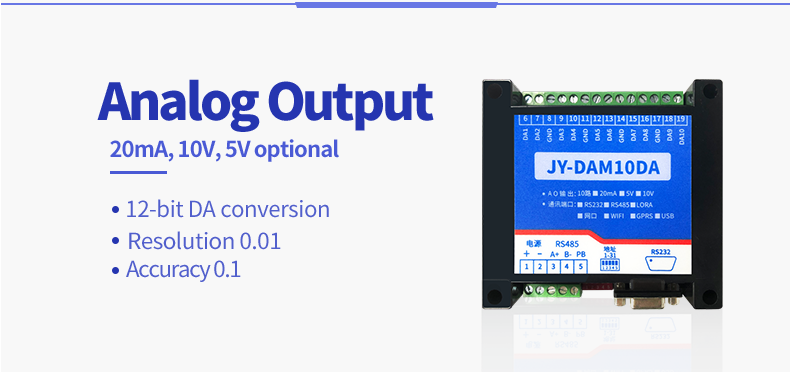 Industrial analog output module, 410 analog outputs (4-20mA, 0-5V, 0-10V); Support RS232, isolated RS485, WiFi, network port and other communication interfaces; Standard Modbus RTU protocol; 12 bit DA conversion; Resolution 0.01