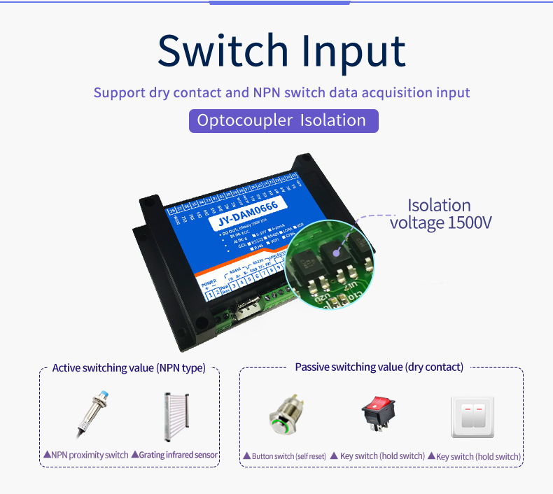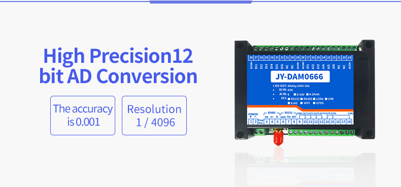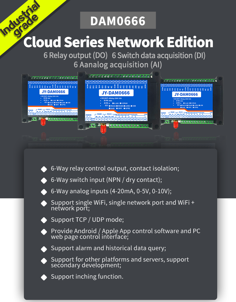 Dam0666 industrial cloud series GPRS version, 6-way relay output (do), 6-way switching value acquisition (DI), 6-way analog value acquisition (AI), 6-way relay control output, contact isolation; 6-way switching value input (NPN / dry contact); 6-channel analog...
