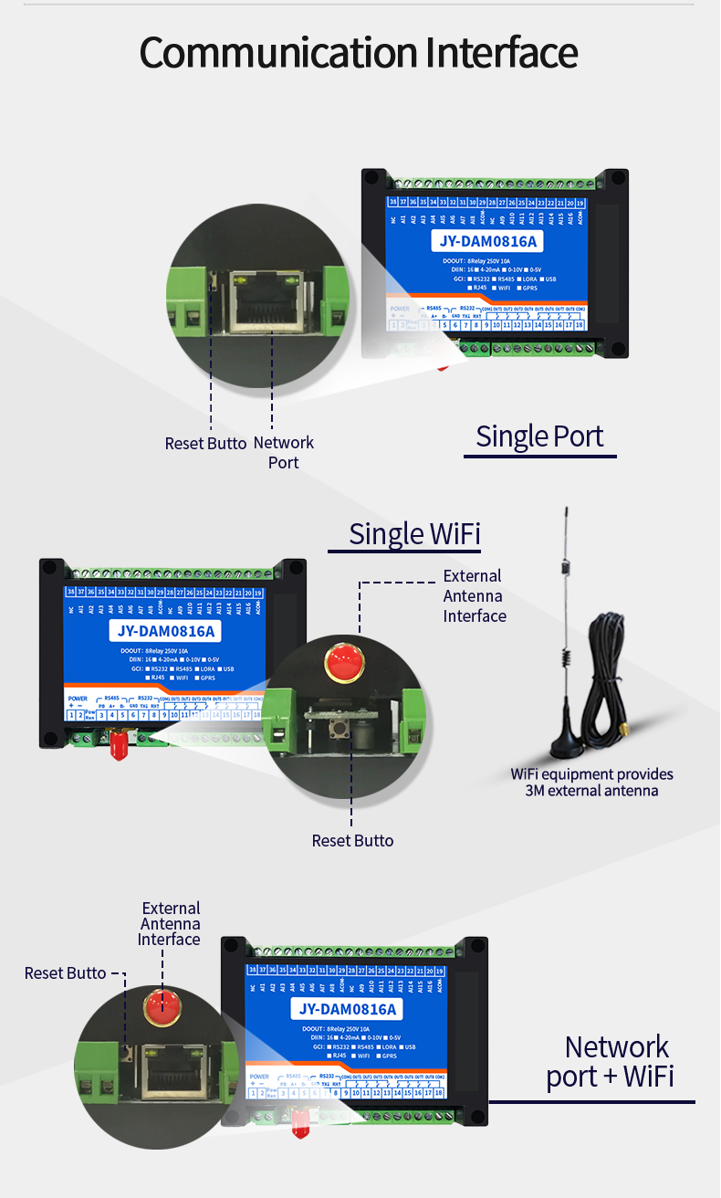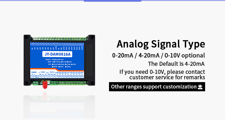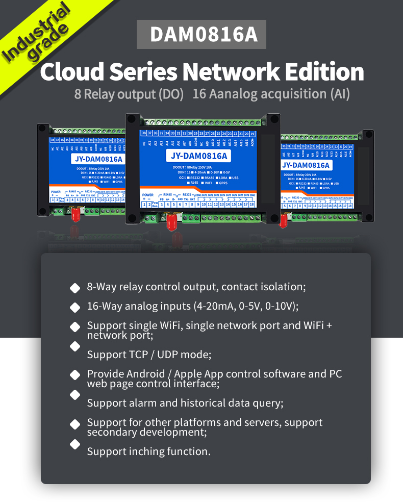 Dam-0816a industrial cloud series network version, 8-Channel relay output (do), 16 channel analog acquisition (AI), 8-Channel relay control output, contact isolation; 16 analog inputs (4-20mA, 0-5V, 0-10V); Support single WiFi, single network port