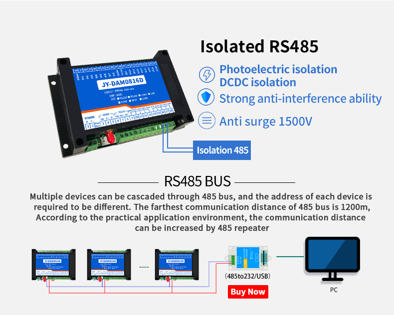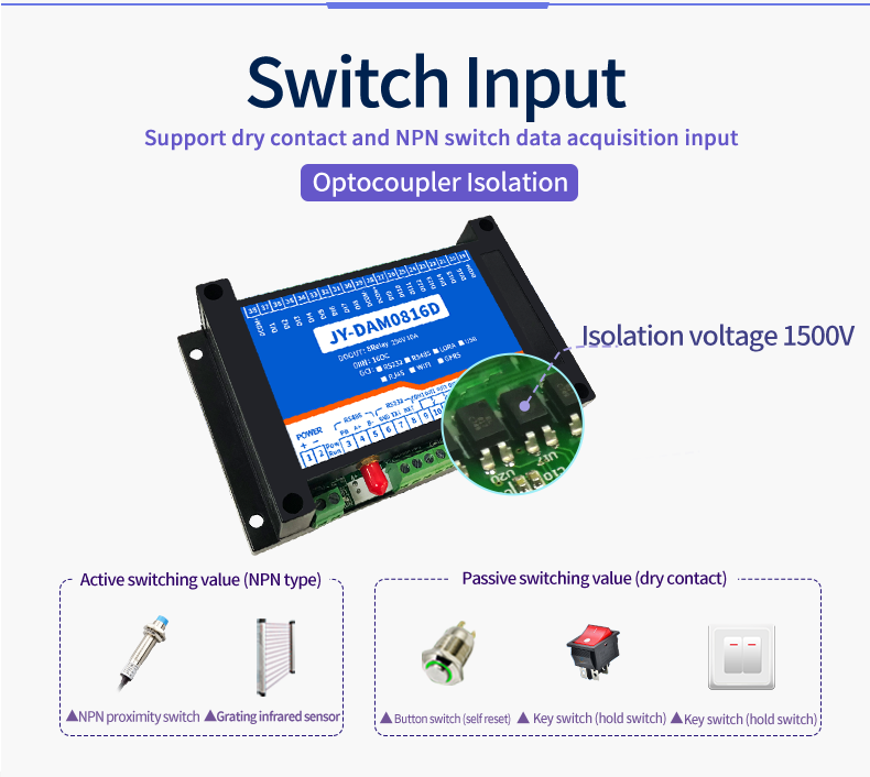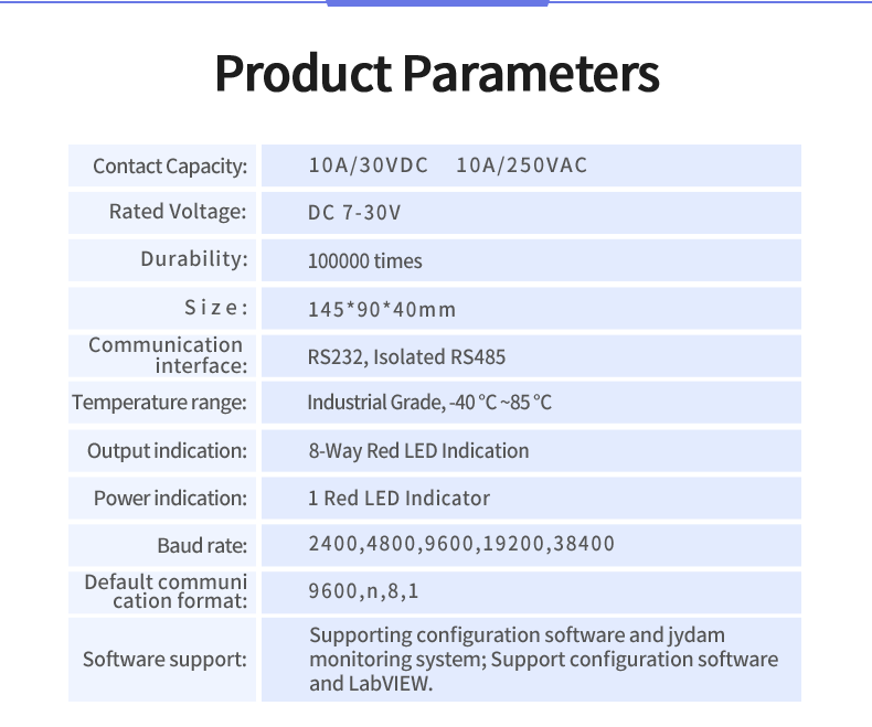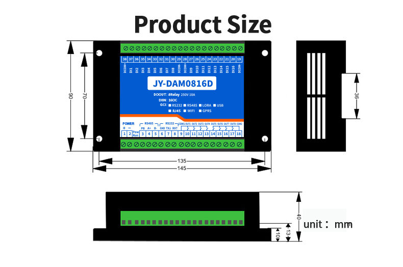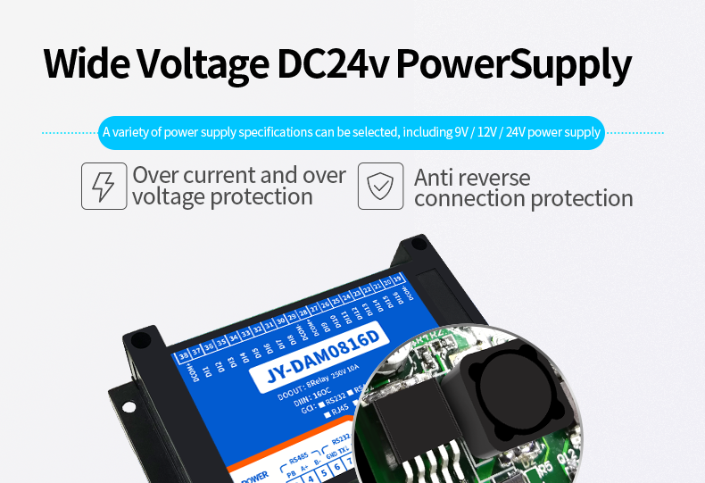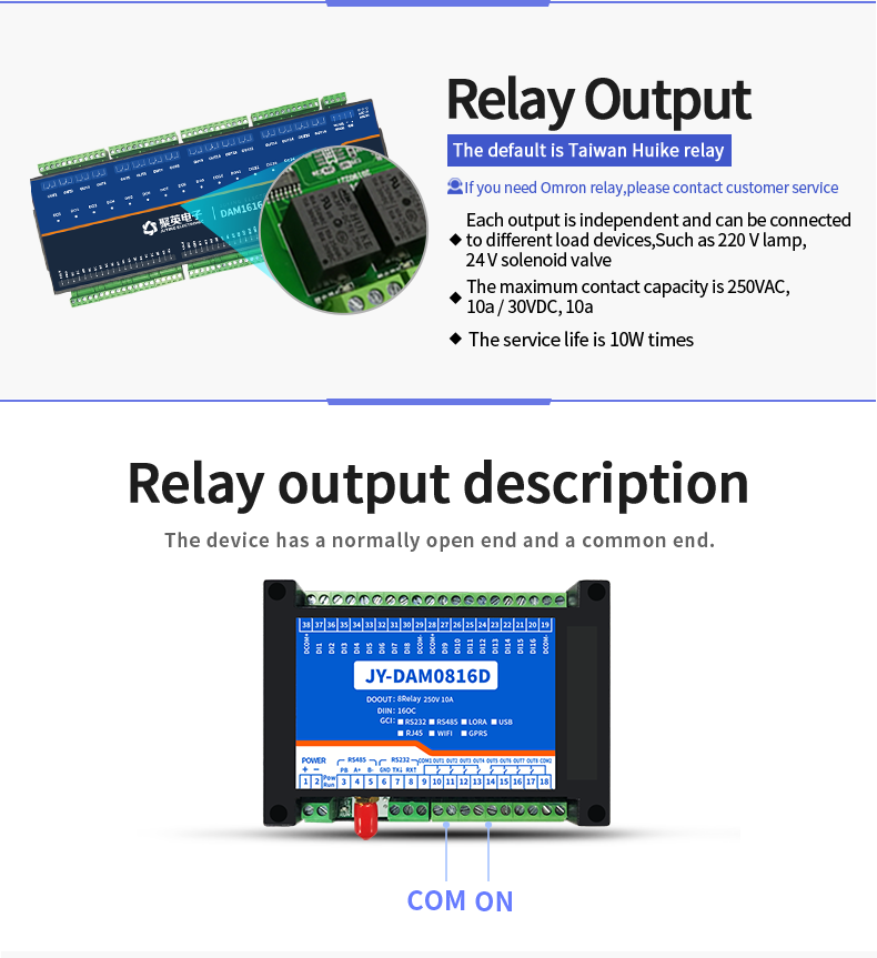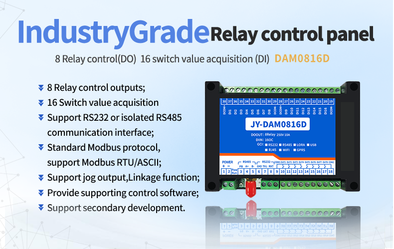 Industrial relay control board, 8-way relay control (do), 16-way switching value acquisition (DI) dam0816d, 8-way relay control output, contact isolation; 16 channel switching value input; Support RS232 or isolated RS485 communication interface; Standard Modbu...