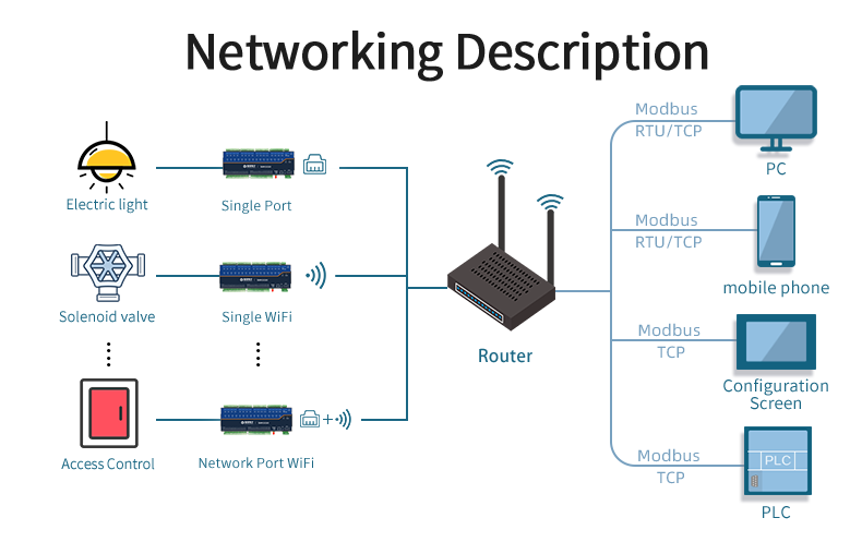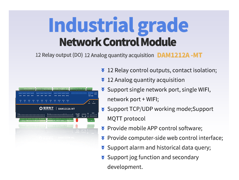 1212a-mt industrial network control module, 12 relay outputs (do), 12 analog acquisition (AI), 12 relay control outputs, contact isolation; 12 analog inputs; It supports three categories: single network port, single WiFi network port + WiFi;