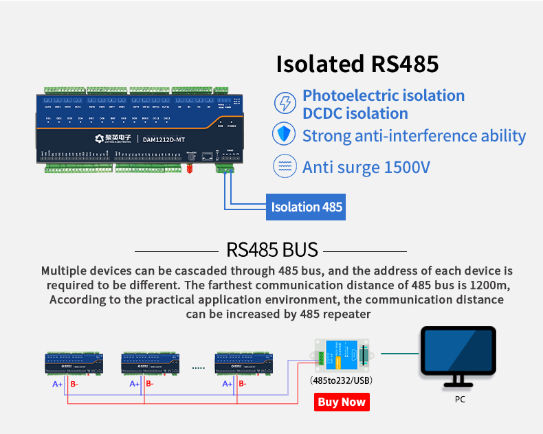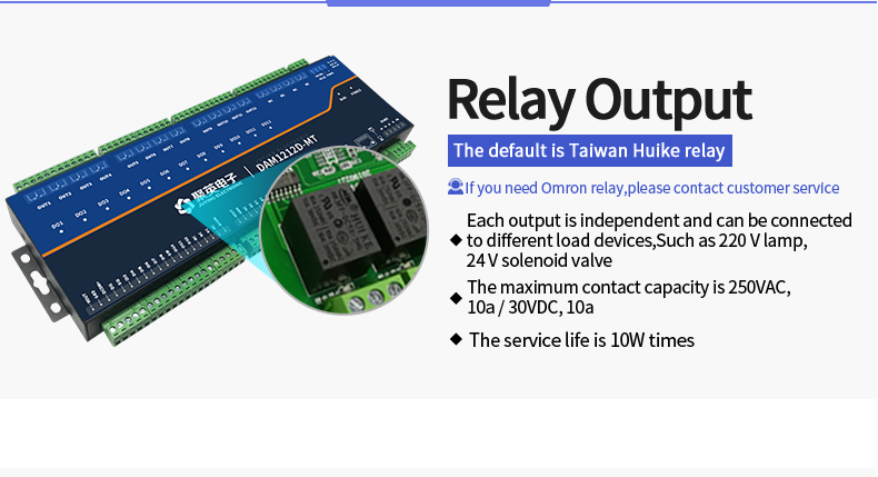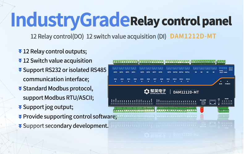 Industrial relay control board, 12 relay control (do), 12 switching value acquisition (DI), 12 relay output; 12 channel switching value input; Standard Modbus protocol, supporting Modbus RTU / ascll; Support RS232 and isolated RS485 communication