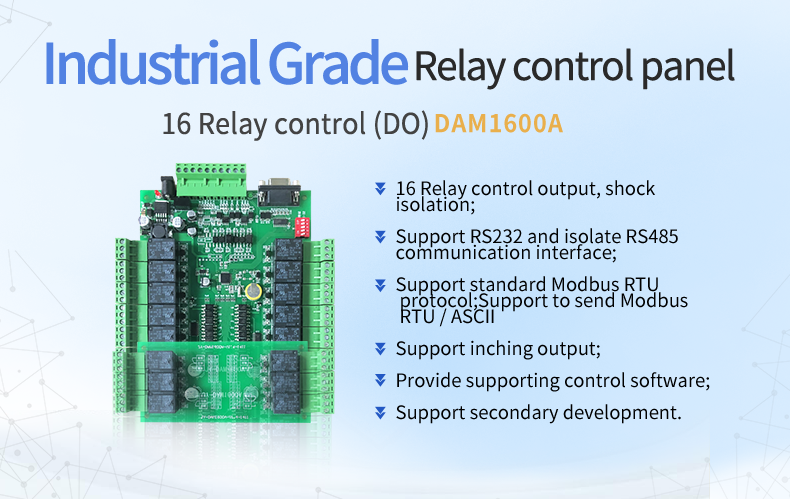 Industrial network control module 16 relay output (do) dam1600a, 16 relay control output, contact isolation; It supports three categories: single network port, single WiFi and network port + WiFi; Support TCP / UDP working mode; Provide Android mobile app cont...