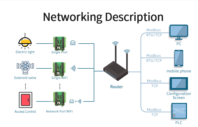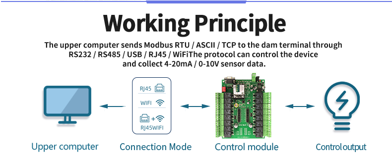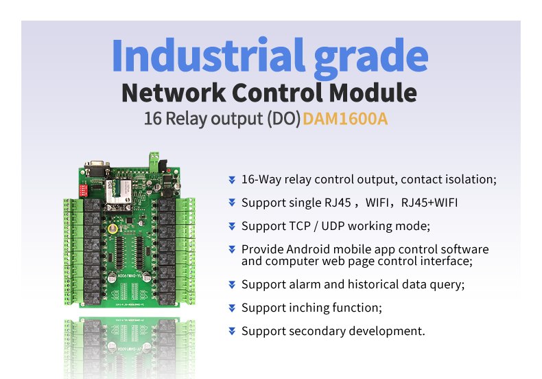 Dam1600a industrial network control module, 16 relay outputs (do), 16 relay control outputs, contact isolation; It supports three categories: single network port, single WiFi and network port + WiFi; Support TCP / UDP working mode; Provide Android mobile app c...