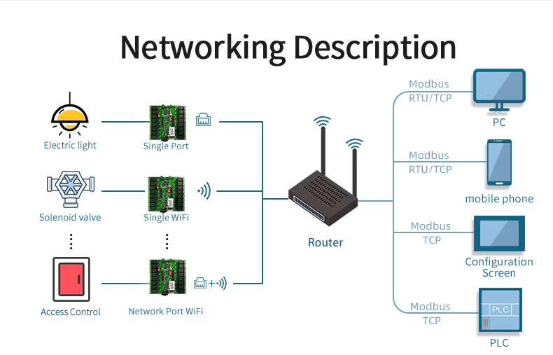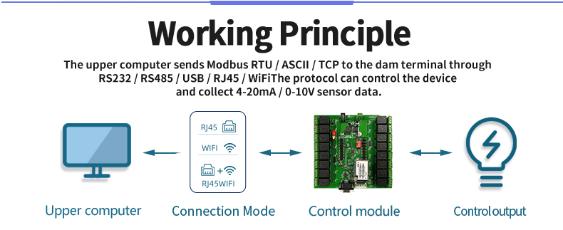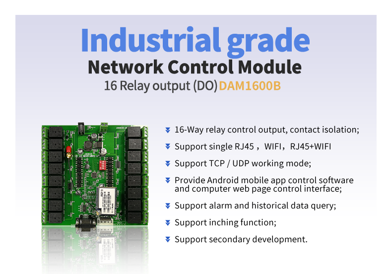 Dam1600b industrial network control module, 16 relay outputs (do), 16 relay control outputs, contact isolation; It supports three categories: single network port, single WiFi and network port + WiFi; Support TCP / UDP working mode; Provide Android mobile app c...