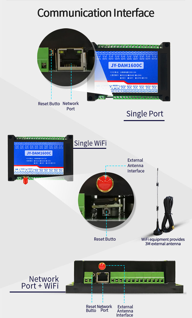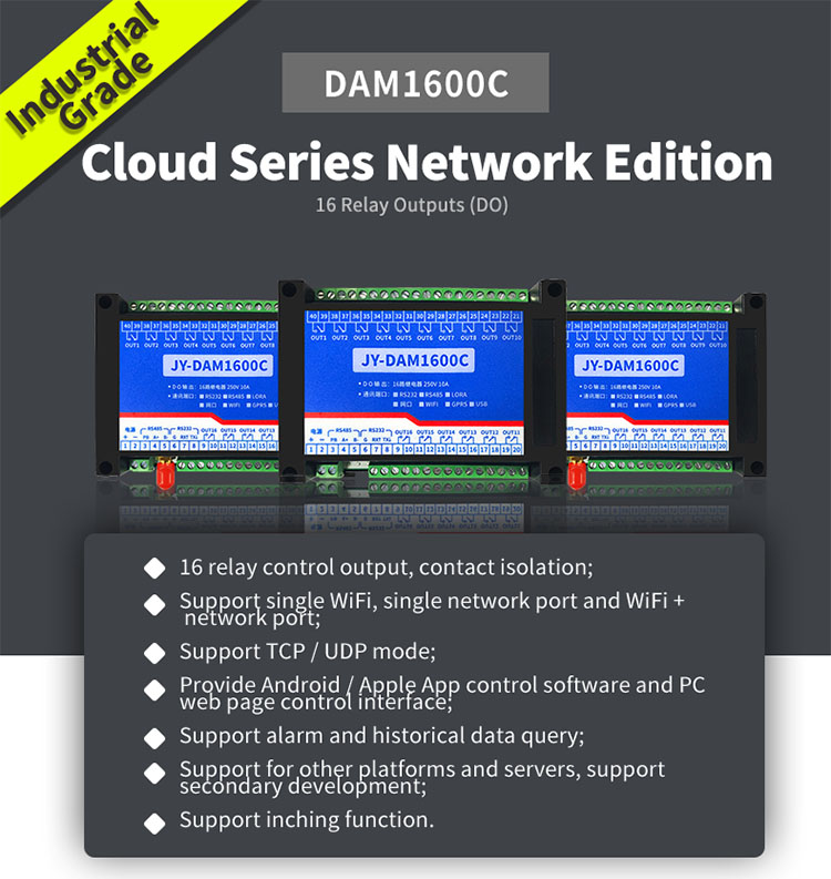 Dam-1600c industrial cloud platform series network version, 16 channel switching value acquisition, 16 channel switching value input (NPN / dry contact); Support three categories: single WiFi, single network port and WiFi + network port; Support TCP / UDP work...
