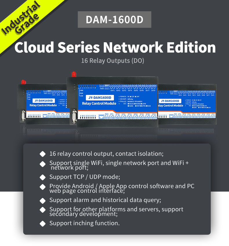 Dam-10102 industrial cloud series network version, 16 relay outputs (do), 16 relay control outputs, contact isolation; Support three categories: single WiFi, single network port and WiFi + network port; Support TCP / UDP working mode; Provide Android / Apple A...