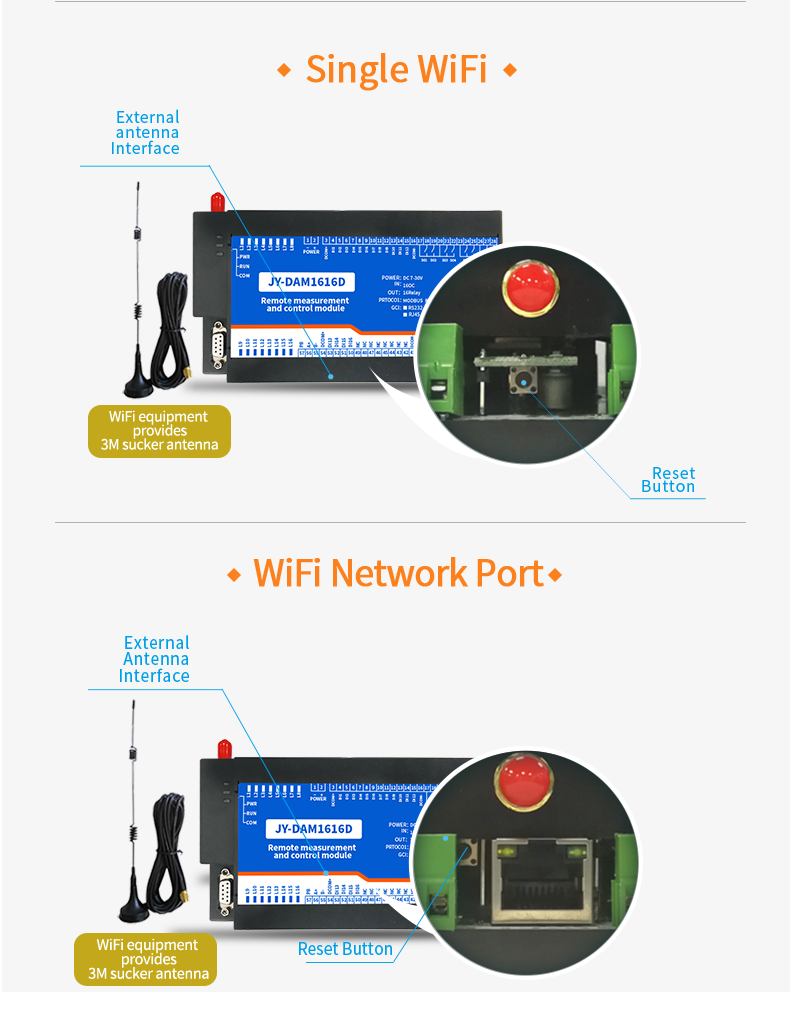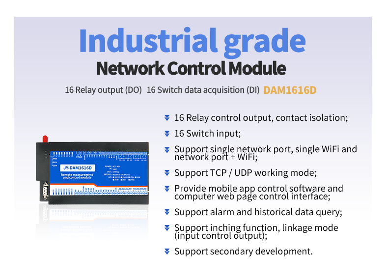 Dam1616 industrial network control module, 16 relay output (do), 16 switching value acquisition (DI), 16 relay control output, contact isolation; 16 channel switching value input; It supports three categories: single network port, single WiFi and network port ...