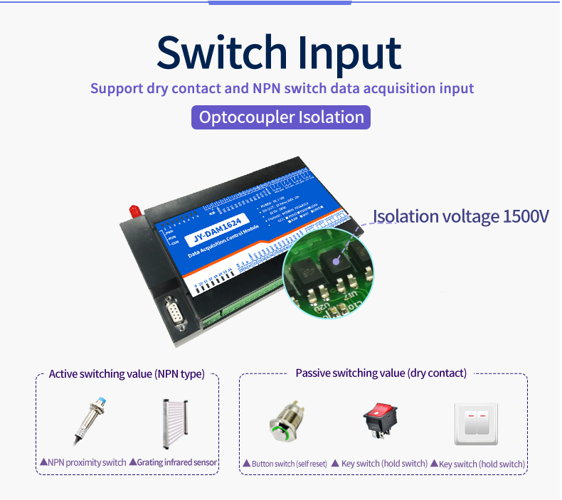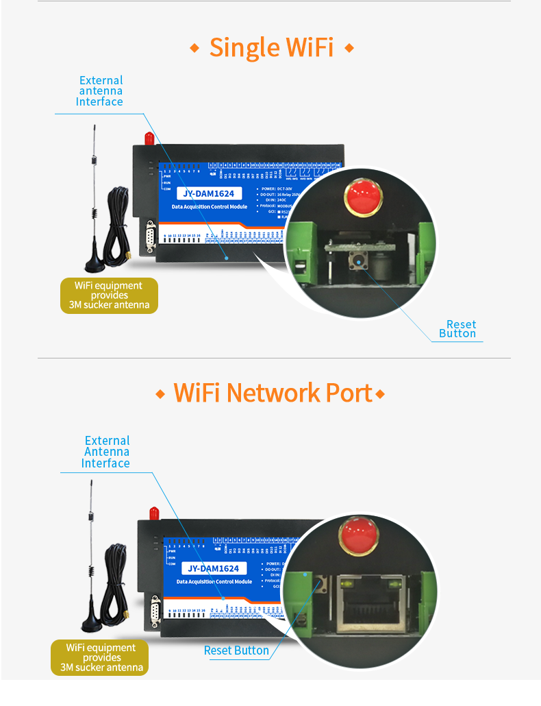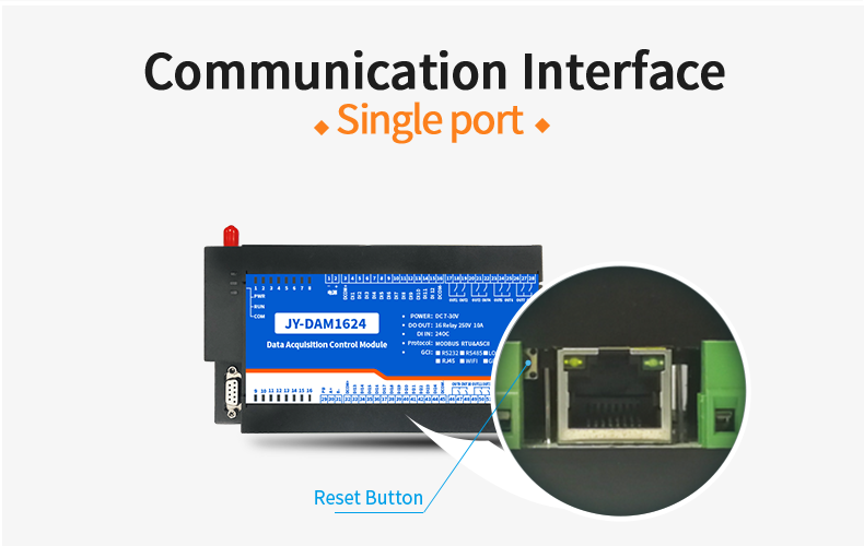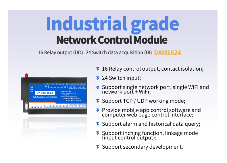 Dam1624 industrial network control module, 16 relay outputs (do), 24 switching value acquisition (DI), 16 relay control outputs, contact isolation; 24 channel switching value input; It supports three categories: single network port, single WiFi and network por...