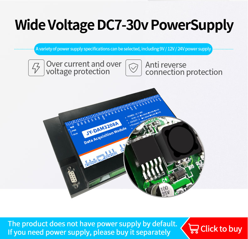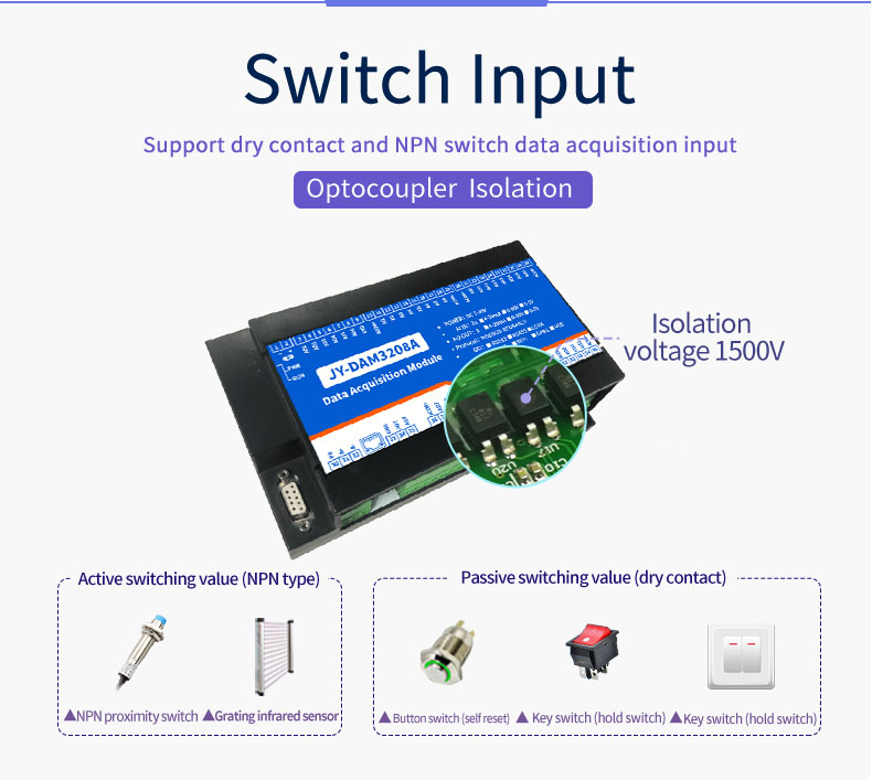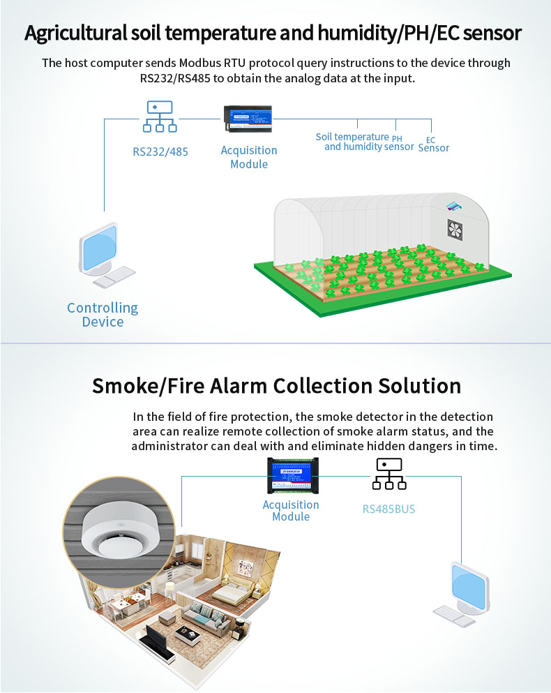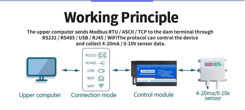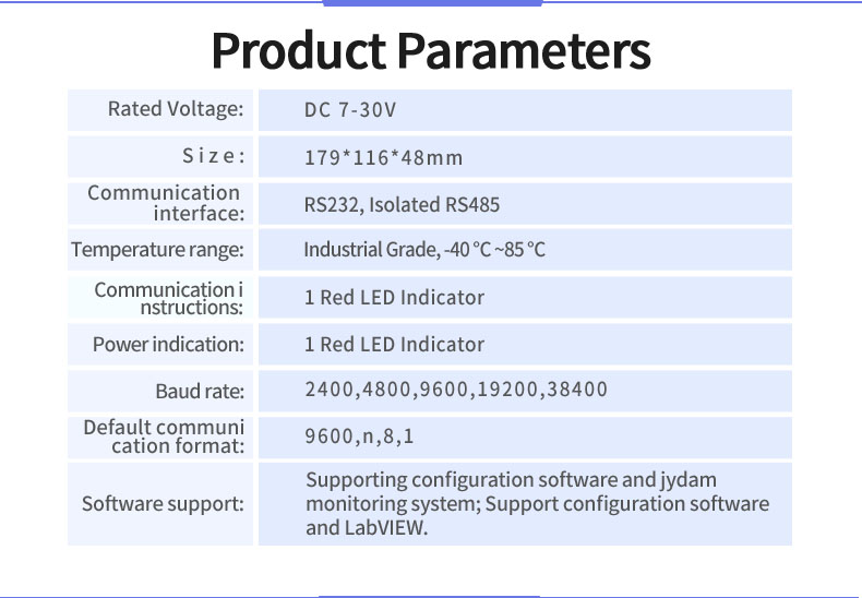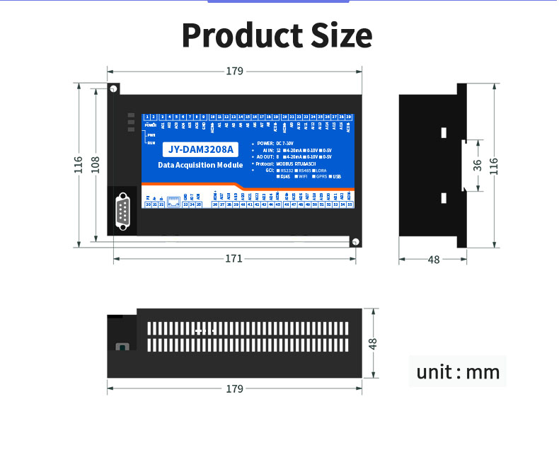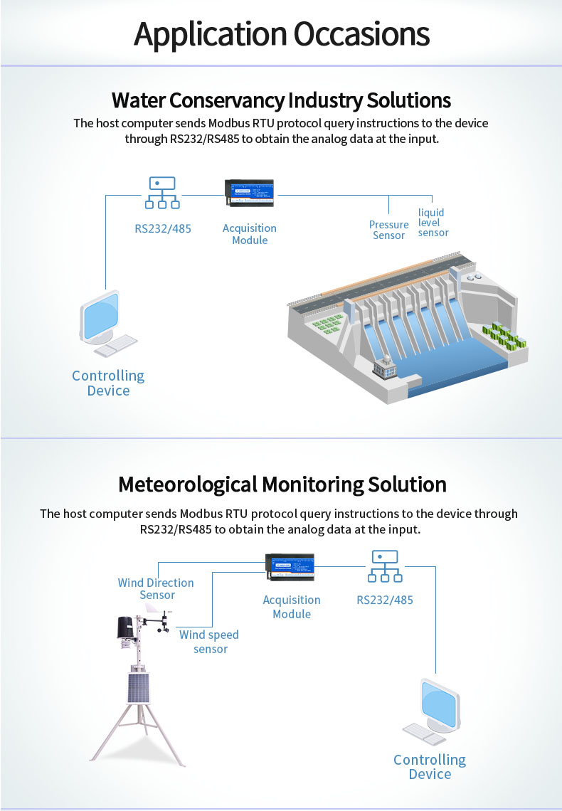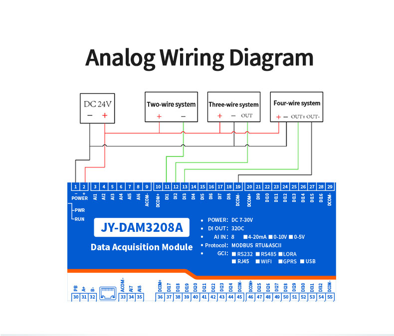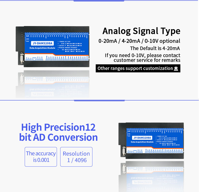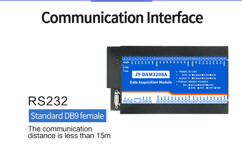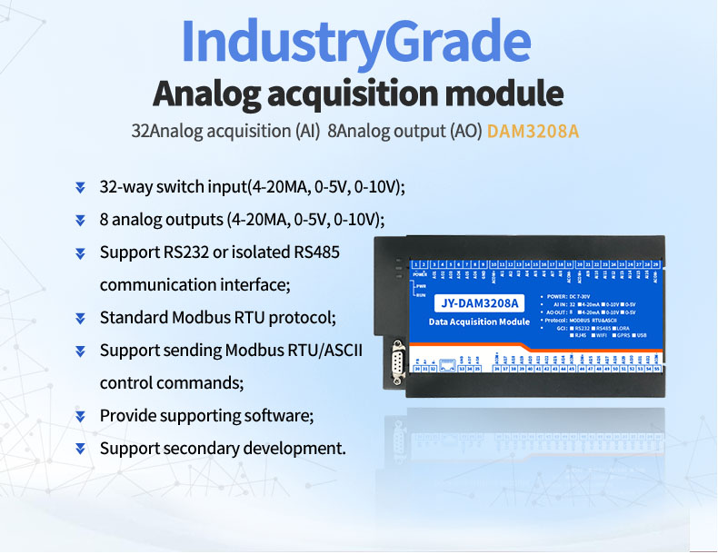 Industrial analog acquisition module, 32 analog inputs (4-20mA, 0-5V, 0-10V); 8 analog outputs (4-20mA, 0-5V, 0-10V); Support RS232 or isolated RS485 communication interface; Standard Modbus RTU protocol