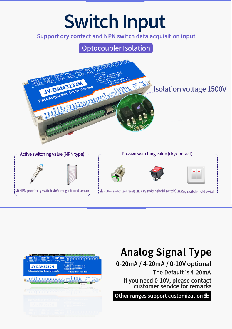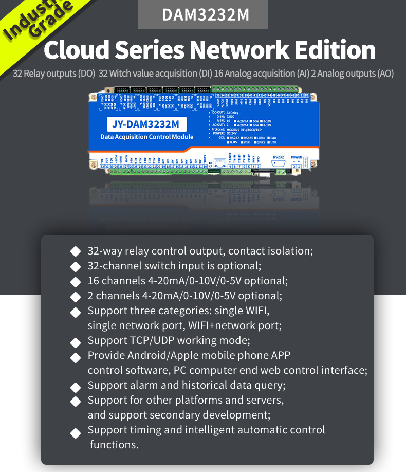 Dam-3232-mt industrial cloud series network version, 32 relay output (D0), 32 switching value acquisition (DI), 32 analog value acquisition (AL), 32 analog output (AO), 32 relay control output, contact isolation; 32 channel switching value input