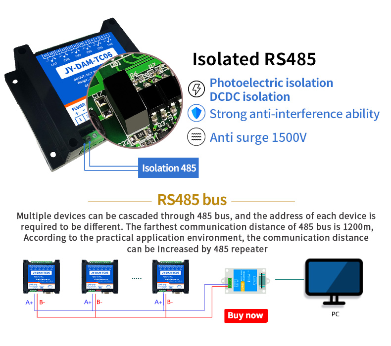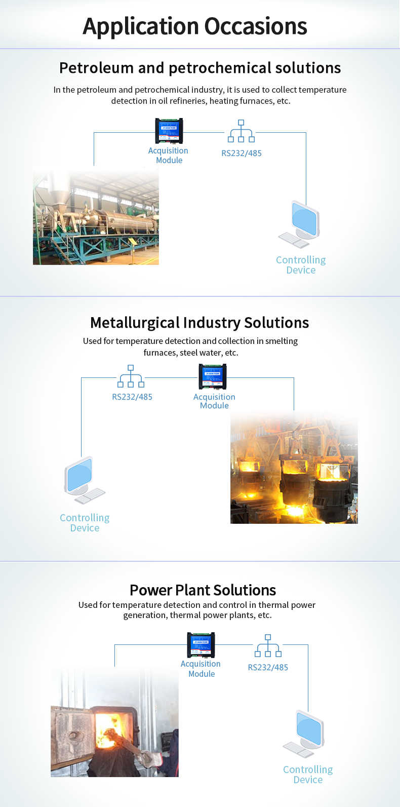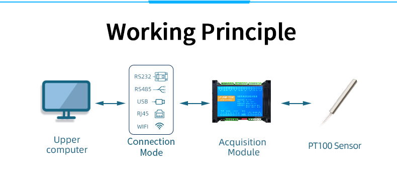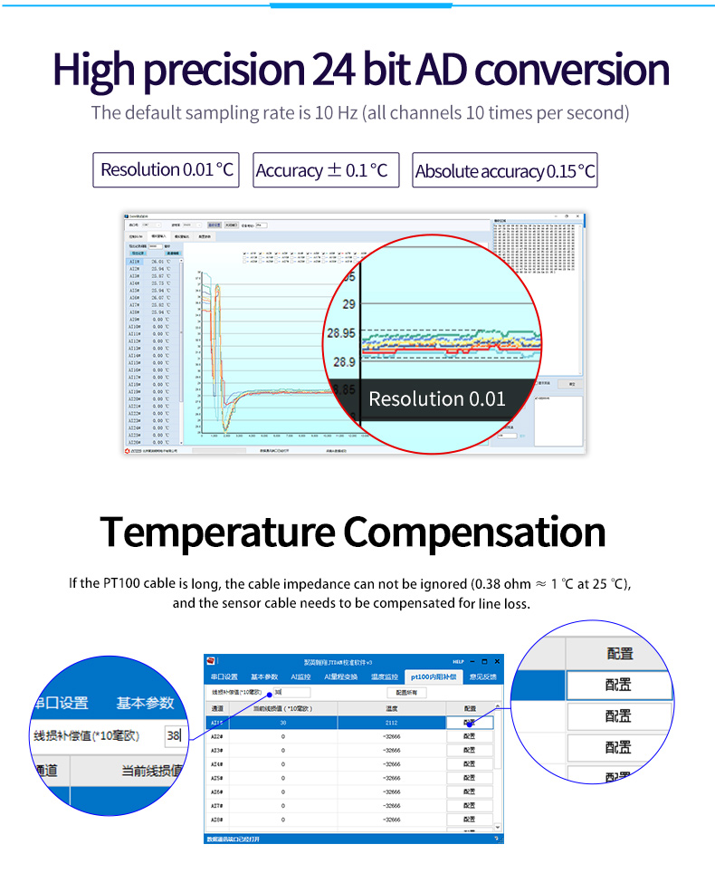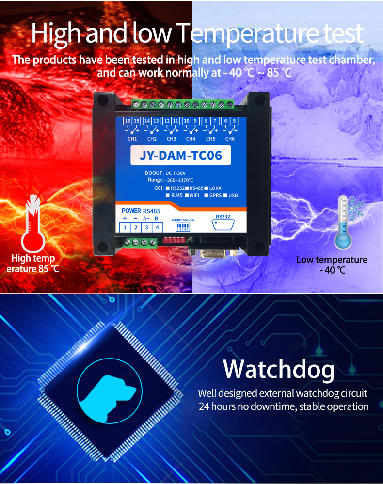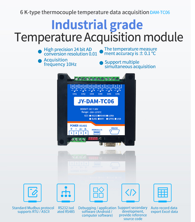 Industrial grade temperature acquisition module, with high-precision 24 bit AD conversion resolution of 0.1, temperature measurement accuracy of up and down 1 ℃, acquisition frequency of 10Hz, supports multi-channel simultaneous acquisition, and can work norma...