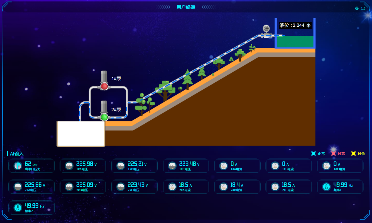 Through the monitoring platform, the staff can monitor the working state, working voltage and current data of the water pump in real time, and remotely and manually control the start and stop of the water pump;