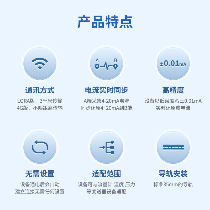 模擬量對傳模塊通過LoRa/4G技術(shù)進(jìn)行通信,信號傳輸穩(wěn)定可靠,不易受到外部干擾,無需設(shè)置設(shè)備通電后會(huì)自動(dòng)建立連接,電流實(shí)時(shí)同步,設(shè)備可與流量計(jì)、溫度、壓力等變送器設(shè)備適配,設(shè)備精度高,誤差低于0.01mA,支持標(biāo)準(zhǔn)35mm導(dǎo)軌安裝。
